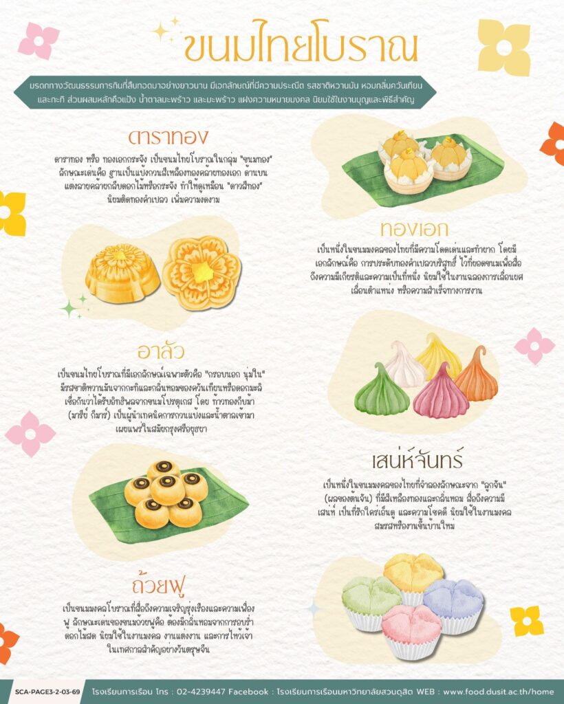 ขนมไทยโบราณ เป็นขนมที่สะท้อนภูมิปัญญา ความประณีต และความเชื่อเรื่องความเป็นสิริมงคลของสังคมไทยในอดีต ตัวอย่างเช่น