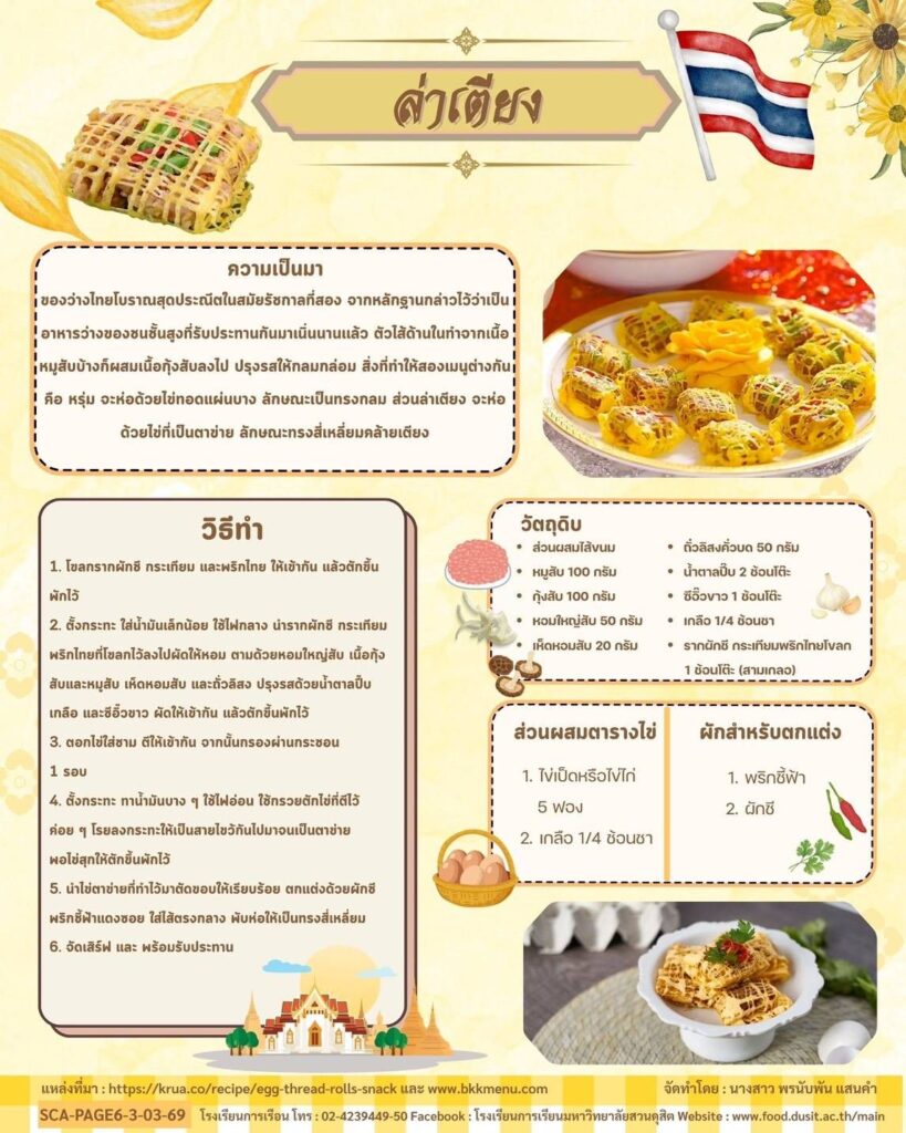 ล่าเตียงเป็นของว่างไทยโบราณสุดประณีตในสมัยรัชกาลที่ 2 จากหลักฐานกล่าวไว้ว่าเป็นอาหารว่างของชนชั้นสูงที่รับประทานกันมาเนิ่นนานเเล้ว ตัวไส้ด้านในทำจากเนื้อหมูสับบ้างก็ผสมเนื้อกุ้งสับลงไป ปรุงรสให้กลมกล่อม สิ่งที่ทำให้สองเมนูต่างกัน คือ หรุ่ม จะห่อด้วยไข่ทอดแผ่นบาง ลักษณะเป็นทรงกลม ส่วนล่าเตียง จะห่อด้วยไข่ที่เป็นตาข่าย ลักษณะทรงสี่เหลี่ยมคล้ายเตียง