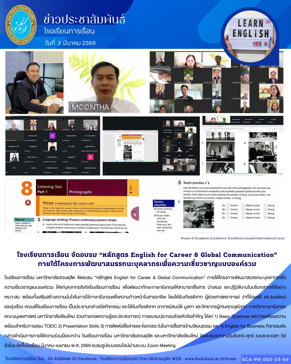 โรงเรียนการเรือน มหาวิทยาลัยสวนดุสิต จัดอบรม “หลักสูตร English for Career & Global Communication” ภายใต้โครงการพัฒนาสมรรถนะบุคลากรเพื่อความเชี่ยวชาญแบบองค์รวม ให้แก่บุคลากรสังกัดโรงเรียนการเรือน เพื่อพัฒนาทักษะภาษาอังกฤษให้สามารถสื่อสาร นำเสนอ และปฏิบัติงานในบริบทสากลได้อย่างเหมาะสม พร้อมทั้งเสริมสร้างความมั่นใจในการใช้ภาษาอังกฤษเพื่อความก้าวหน้าในสายอาชีพ โดยได้รับเกียรติจาก ผู้ช่วยศาสตราจารย์ ว่าที่ร้อยตรี ดร.ธนพัฒน์ แสงรุ่งเรือง คณบดีโรงเรียนการเรือน เป็นประธานกล่าวเปิดกิจกรรม และได้รับเกียรติจาก อาจารย์สมบัติ มูลทา และวิทยากรผู้ทรงคุณวุฒิจาก ภาควิชาภาษาอังกฤษ คณะมนุษยศาสตร์ มหาวิทยาลัยเชียงใหม่ ร่วมถ่ายทอดความรู้และประสบการณ์ การอบรมประกอบด้วยหัวข้อสำคัญ ได้แก่ 1) Basic Grammar และการเตรียมความพร้อมสำหรับการสอบ TOEIC 2) Presentation Skills 3) การติดต่อสื่อสารและข้อควรระวังในการสื่อสารข้ามวัฒนธรรม และ 4) English for Business กิจกรรมดังกล่าวดำเนินการภายใต้ความร่วมมือระหว่าง โรงเรียนการเรือน มหาวิทยาลัยสวนดุสิต และมหาวิทยาลัยเชียงใหม่ จัดอบรมระหว่างวันจันทร์–ศุกร์ รวมระยะเวลา 50 ชั่วโมง จัดขึ้นในเดือน มีนาคม–เมษายน พ.ศ. 2569 อบรมรูปแบบออนไลน์ผ่านระบบ Zoom Meeting