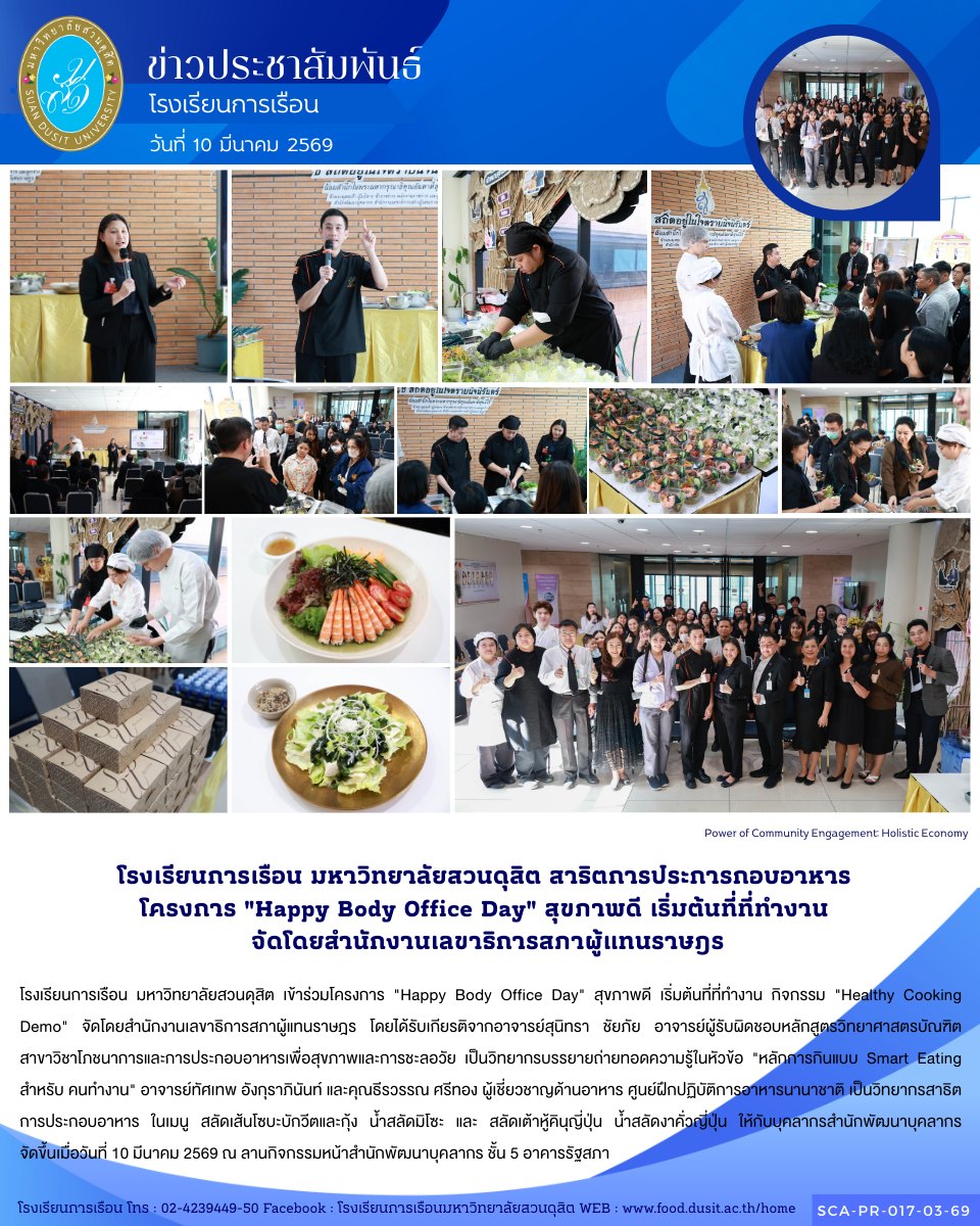 โรงเรียนการเรือน มหาวิทยาลัยสวนดุสิต เข้าร่วมโครงการ “Happy Body Office Day” สุขภาพดี เริ่มต้นที่ที่ทำงาน กิจกรรม “Healthy Cooking Demo” จัดโดยสำนักงานเลขาธิการสภาผู้แทนราษฎร โดยได้รับเกียรติจากอาจารย์สุนิทรา ชัยภัย อาจารย์ผู้รับผิดชอบหลักสูตรวิทยาศาสตรบัณฑิต สาขาวิชาโภชนาการและการประกอบอาหารเพื่อสุขภาพและการชะลอวัย เป็นวิทยากรบรรยายถ่ายทอดความรู้ในหัวข้อ “หลักการกินแบบ Smart Eating สำหรับ คนทำงาน” อาจารย์ทัศเทพ อังกุราภินันท์ และคุณธีรวรรณ ศรีทอง ผู้เชี่ยวชาญด้านอาหาร ศูนย์ฝึกปฏิบัติการอาหารนานาชาติ เป็นวิทยากรสาธิตการประกอบอาหาร ในเมนู สลัดเส้นโซบะบักวีตและกุ้ง น้ำสลัดมิโซะ และ สลัดเต้าหู้คินุญี่ปุ่น น้ำสลัดงาคั่วญี่ปุ่น ให้กับบุคลากรสำนักพัฒนาบุคลากร จัดขึ้นเมื่อวันที่ 10 มีนาคม 2569 ณ ลานกิจกรรมหน้าสำนักพัฒนาบุคลากร ชั้น 5 อาคารรัฐสภา