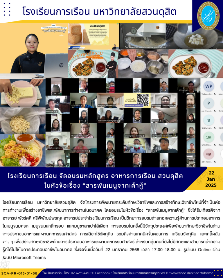 โรงเรียนการเรือน มหาวิทยาลัยสวนดุสิต จัดโครงการพัฒนายกระดับทักษะวิชาชีพและการสร้างทักษะวิชาชีพใหม่ที่จำเป็นต่อการทำงานเพื่อสร้างอาชีพและพัฒนาการทำงานในอนาคต โดยอบรมในหัวข้อเรื่อง “สารพันเมนูขนมไทยร่วมสมัย” ซึ่งได้รับเกียรติจาก อ.สุปรียา ถาวรรักษ์ อาจารย์ประจำโรงเรียนการเรืิอน เป็นวิทยากรอบรมถ่ายทอดความรู้เรื่องอาหารและการทำเมนูวุ้นกะทิมะพร้าวน้ำหอม ขนมลืมกลืนอัญชันดอกไม้ ขนมถ้วย วุ้นกรอบ สังขยาใบเตย และ มะละกอสานรังแตนเชื่อม การอบรมในครั้งนี้มีวัตถุประสงค์เพื่อพัฒนาทักษะวิชาชีพในด้านการประกอบอาหาร การเลือกใช้วัตถุดิบ รวมถึงด้านเทคนิค ขั้นตอนการเตรียมวัตถุดิบ และเคล็ดลับในการทำอาหาร เพื่อสร้างทักษะวิชาชีพด้านการประกอบอาหาร สำหรับกลุ่มคนที่ยังไม่มีทักษะ และสามารถนำความรู้ที่ได้ไปใช้ในการประกอบอาชีพในอนาคต ซึ่งจัดขึ้นเมื่อวันที่ 22 พฤศจิกายน 2566 เวลา 17.00-18.00 น. รูปแบบ Online ผ่านระบบ Microsoft Teams