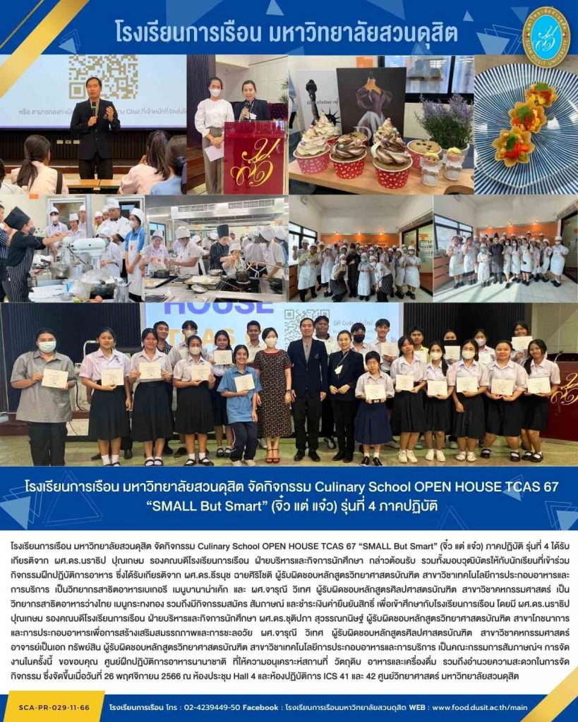 โรงเรียนการเรือน มหาวิทยาลัยสวนดุสิต จัดกิจกรรม Culinary School OPEN HOUSE TCAS 67 “SMALL But Smart” (จิ๋ว แต่ แจ๋ว) ภาคปฏิบัติ รุ่นที่ 4 ได้รับเกียรติจาก ผศ.ดร.นราธิป ปุณเกษม รองคณบดีโรงเรียนการเรือน ฝ่ายบริหารและกิจการนักศึกษา กล่าวต้อนรับ รวมทั้งมอบวุฒิบัตรให้กับนักเรียนที่เข้าร่วมกิจกรรมฝึกปฏิบัติการอาหาร ซึ่งได้รับเกียรติจาก ผศ.ดร.ธีรนุช ฉายศิริโชติ ผู้รับผิดชอบหลักสูตรวิทยาศาสตรบัณฑิต สาขาวิชาเทคโนโลยีการประกอบอาหารและการบริการ เป็นวิทยากรสาธิตอาหารเบเกอรี เมนูบานาน่าเค้ก และ ผศ.จารุณี วิเทศ ผู้รับผิดชอบหลักสูตรศิลปศาสตรบัณฑิต สาขาวิชาคหกรรมศาสตร์ เป็นวิทยากรสาธิตอาหารว่างไทย เมนูกระทงทอง รวมถึงมีกิจกรรมสมัคร สัมภาษณ์ และชำระเงินค่ายืนยันสิทธิ์ เพื่อเข้าศึกษากับโรงเรียนการเรือน โดยมี ผศ.ดร.นราธิป ปุณเกษม รองคณบดีโรงเรียนการเรือน ฝ่ายบริหารและกิจการนักศึกษา ผศ.ดร.ชุติปภา สุวรรณกนิษฐ์ ผู้รับผิดชอบหลักสูตรวิทยาศาสตรบัณฑิต สาขาโภชนาการและการประกอบอาหารเพื่อการสร้างเสริมสมรรถภาพและการชะลอวัย ผศ.จารุณี วิเทศ ผู้รับผิดชอบหลักสูตรศิลปศาสตรบัณฑิต สาขาวิชาคหกรรมศาสตร์ อาจารย์เป็นเอก ทรัพย์สิน ผู้รับผิดชอบหลักสูตรวิทยาศาสตรบัณฑิต สาขาวิชาเทคโนโลยีการประกอบอาหารและการบริการ เป็นคณะกรรมการสัมภาษณ์ฯ การจัดงานในครั้งนี้ ขอขอบคุณ ศูนย์ฝึกปฏิบัติการอาหารนานาชาติ ที่ให้ความอนุเคราะห์สถานที่ วัตถุดิบ อาหารและเครื่องดื่ม รวมถึงอำนวยความสะดวกในการจัดกิจกรรม ซึ่งจัดขึ้นเมื่อวันที่ 26 พฤศจิกายน 2566 ณ ห้องประชุม Hall 4 และห้องปฏิบัติการ ICS 41 และ 42 ศูนย์วิทยาศาสตร์ มหาวิทยาลัยสวนดุสิต