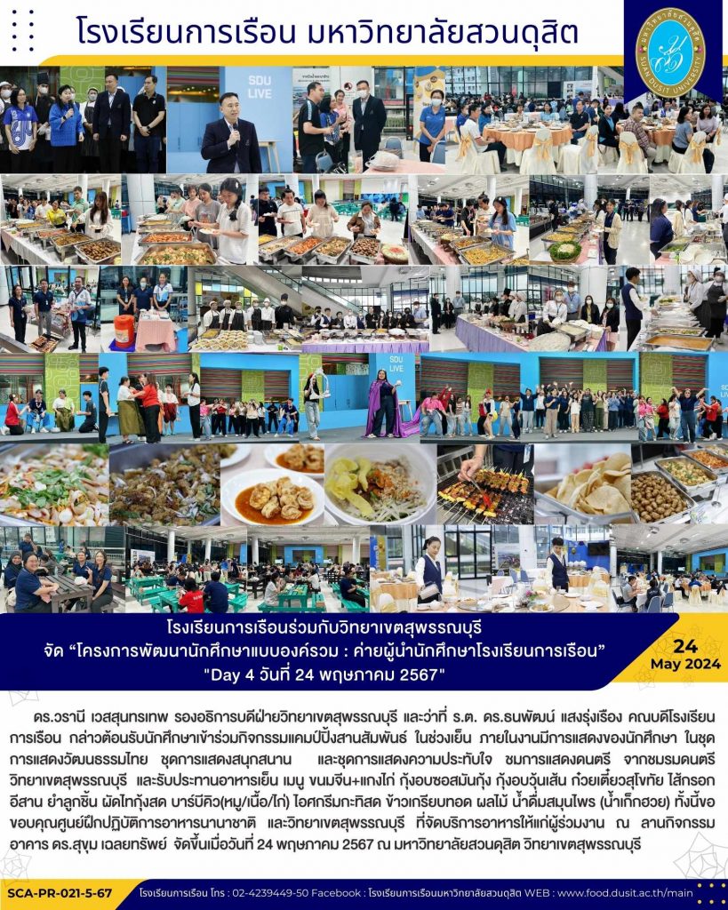 ดร.วรานี เวสสุนทรเทพ รองอธิการบดีฝ่ายวิทยาเขตสุพรรณบุรี และว่าที่ ร.ต. ดร.ธนพัฒน์ แสงรุ่งเรือง คณบดีโรงเรียน การเรือน กล่าวต้อนรับนักศึกษาเข้าร่วมกิจกรรมแคมป์ปิ้งสานสัมพันธ์ ในช่วงเย็น ภายในงานมีการแสดงของนักศึกษา ในชุดการแสดงวัฒนธรรมไทย ชุดการแสดงสนุกสนาน และชุดการแสดงความประทับใจ ชมการแสดงดนตรี จากชมรมดนตรีวิทยาเขตสุพรรณบุรี และรับประทานอาหารเย็น เมนู ขนมจีน+แกงไก่ กุ้งอบซอสมันกุ้ง กุ้งอบวุ้นเส้น ก๋วยเตี๋ยวสุโขทัย ไส้กรอกอีสาน ยำลูกชิ้น ผัดไทกุ้งสด บาร์บีคิว(หมู/เนื้อ/ไก่) ไอศกรีมกะทิสด ข้าวเกรียบทอด ผลไม้ น้ำดื่มสมุนไพร (น้ำเก็กฮวย) ทั้งนี้ขอขอบคุณศูนย์ฝึกปฏิบัติการอาหารนานาชาติ และวิทยาเขตสุพรรณบุรี ที่จัดบริการอาหารให้แก่ผู้ร่วมงาน ณ ลานกิจกรรมอาคาร ดร.สุขุม เฉลยทรัพย์ จัดขึ้นเมื่อวันที่ 24 พฤษภาคม 2567 ณ มหาวิทยาลัยสวนดุสิต วิทยาเขตสุพรรณบุรี