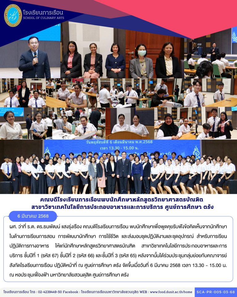 ดร. ขวัญนภา สุขคร ผู้อำนวยการ ศูนย์การศึกษา ลำปาง ให้การต้อนรับ ว่าที่ร้อยตรี ดร.ธนพัฒน์ แสงรุ่งเรือง คณบดีโรงเรียนการเรือนและคณะทำงาน ในกิจกรรมพบนักศึกษาเพื่อพูดคุยรับฟังข้อคิดเห็นจากนักศึกษาในด้านเรียนการสอน การพัฒนานักศึกษา การใช้ชีวิต และส่งมอบชุดมีดและอุปกรณ์สำหรับปฏิบัติการทางด้านอาหาร ให้แก่นักศึกษาหลักสูตรวิทยาศาสตรบัณฑิต สาขาวิชาเทคโนโลยีการประกอบอาหารและการบริการ ชั้นปีที่ 1 (รหัส 66) ชั้นปีที่ 2 (รหัส 65) หลังจากนั้นได้ประชุมคณาจารย์ สังกัดโรงเรียนการเรือน ที่ปฏิบัติหน้าที่ ณ ศูนย์การศึกษา ลำปาง จัดขึ้นเมื่อวันที่ 16 พฤษภาคม 2567 ณ หอประชุม ชั้น 2 มหาวิทยาลัยสวนดุสิต ศูนย์การศึกษา ลำปาง