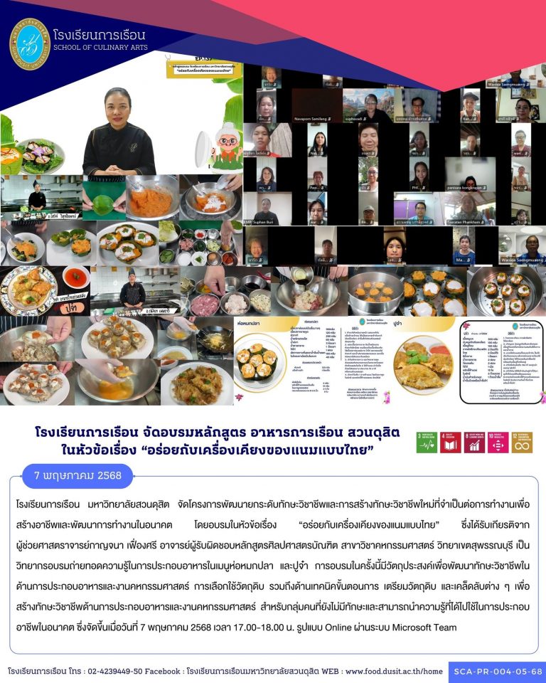 โรงเรียนการเรือน จัดโครงการบัณฑิตพันธุ์ใหม่ หลักสูตร Non-Degree “การออกแบบอาหารสำหรับเด็กระดับปฐมวัยและประถมศึกษา” ให้กับบุคลากรทางการศึกษา โดยได้รับเกียรติจาก อาจารย์ณัจยา เมฆราวี ผู้รับผิดชอบหลักสูตรวิทยาศาสตรบัณฑิต สาขาวิชาเทคโนโลยีการประกอบอาหารและการบริการ อาจารย์ชมนาท ชื่นฉ่ำ อาจารย์ประจำโรงเรียนการเรือน และอาจารย์พุทธิพงษ์ เชี่ยววิจิตรพันธุ์ ผู้เชี่ยวชาญทางด้านอาหาร เป็นวิทยากรอบรมเชิงปฏิบัติการหมวดข้าว แป้ง ในเมนูข้าวคลุกกะปิโรล ข้าวมันไก่ต้มและทอด ข้าวต้มทรงเครื่อง ก๋วยเตี๋ยวราดหน้าหมูสับ และมักกะโรนีไส้กรอก ทั้งนี้ได้รับเกียรติจาก อาจารย์นันทพร รุจิขจร อาจารย์สังกัดโรงเรียนการเรือน ได้ร่วมให้คำแนะนำการออกแบบและจัดตกแต่งอาหาร จัดขึ้นในวันที่ 13 กรกฎาคม 2567 เวลา 08.00 – 17.00 น. ณ ห้องปฏิบัติการอาคารปราโมทย์ 2 มหาวิทยาลัยสวนดุสิต วิทยาเขตสุพรรณบุรี