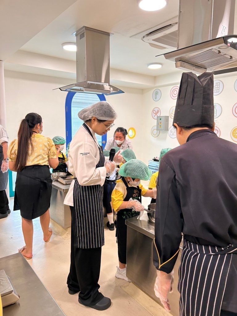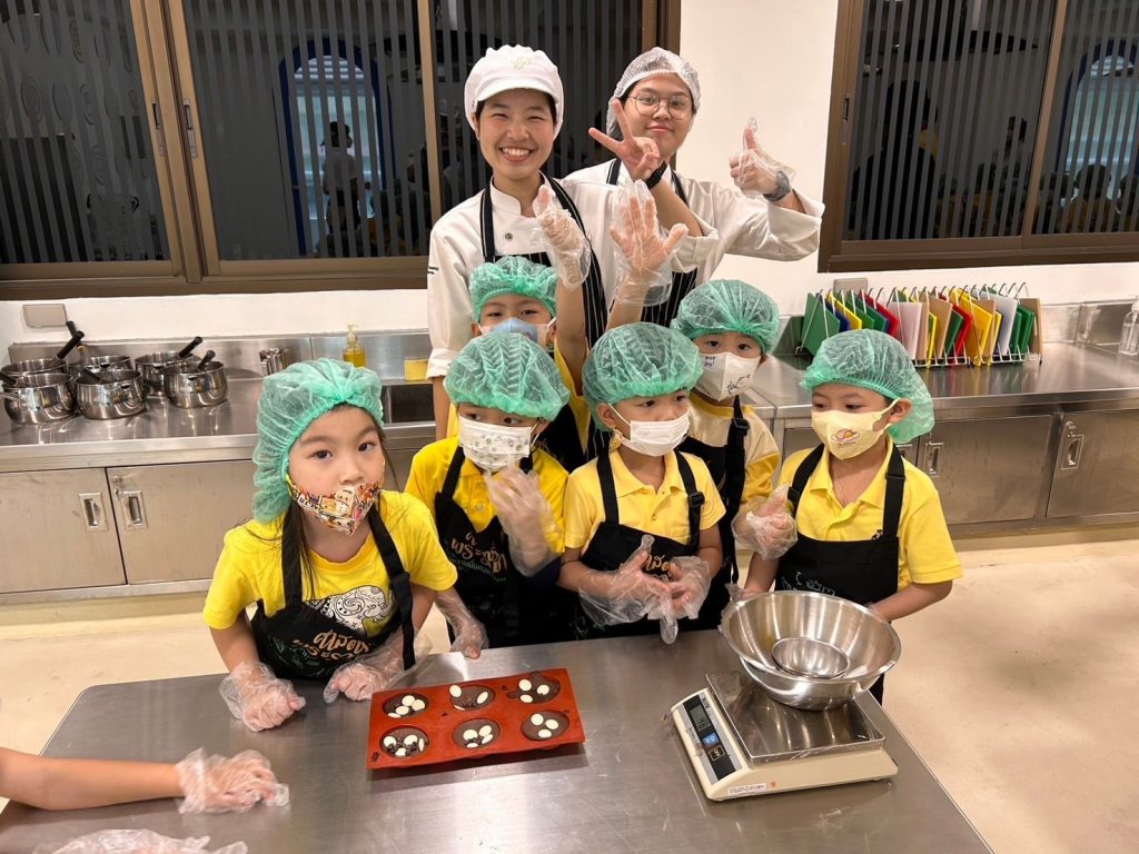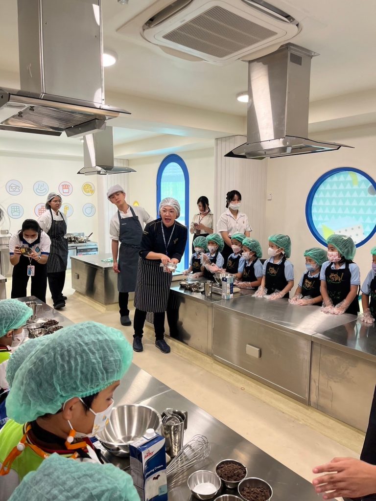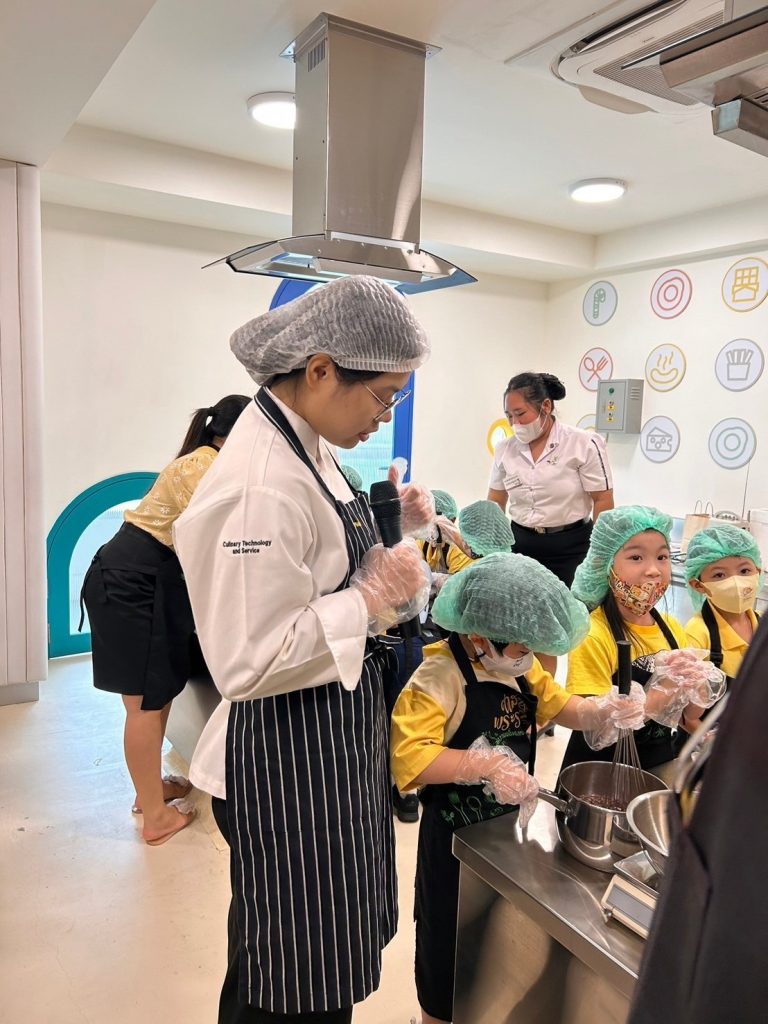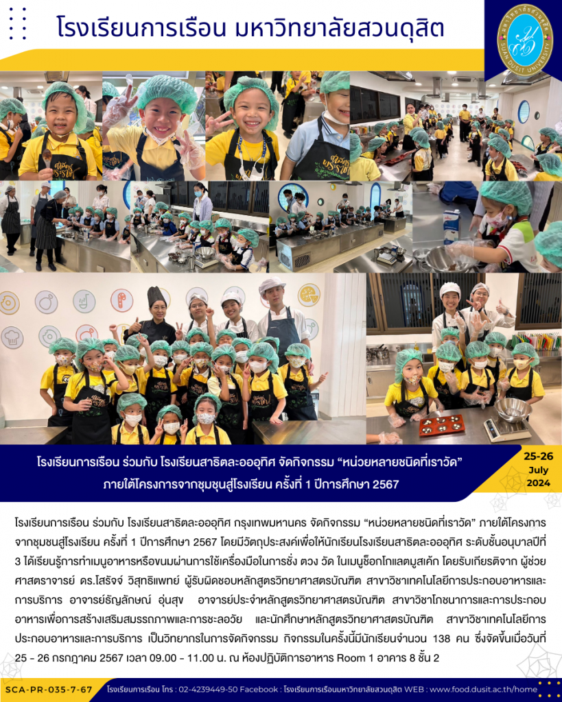 โรงเรียนการเรือน ร่วมกับ โรงเรียนสาธิตละอออุทิศ กรุงเทพมหานคร จัดกิจกรรม “หน่วยหลายชนิดที่เราวัด” ภายใต้โครงการจากชุมชนสู่โรงเรียน ครั้งที่ 1 ปีการศึกษา 2567 โดยมีวัตถุประสงค์เพื่อให้นักเรียนโรงเรียนสาธิตละอออุทิศ ระดับชั้นอนุบาลปีที่ 3 ได้เรียนรู้การทำเมนูอาหารหรือขนมผ่านการใช้เครื่องมือในการชั่ง ตวง วัด ในเมนูช็อกโกแลตมูสเค้ก โดยรับเกียรติจาก ผู้ช่วยศาสตราจารย์ ดร.โสรัจจ์ วิสุทธิแพทย์ ผู้รับผิดชอบหลักสูตรวิทยาศาสตรบัณฑิต สาขาวิชาเทคโนโลยีการประกอบอาหารและการบริการ อาจารย์ธัญลักษณ์ อุ่นสุข อาจารย์ประจำหลักสูตรวิทยาศาสตรบัณฑิต สาขาวิชาโภชนาการและการประกอบอาหารเพื่อการสร้างเสริมสมรรถภาพและการชะลอวัย และนักศึกษาหลักสูตรวิทยาศาสตรบัณฑิต สาขาวิชาเทคโนโลยีการประกอบอาหารและการบริการ เป็นวิทยากรในการจัดกิจกรรม กิจกรรมในครั้งนี้มีนักเรียนจำนวน 138 คน ซึ่งจัดขึ้นเมื่อวันที่ 25 – 26 กรกฎาคม 2567 เวลา 09.00 – 11.00 น. ณ ห้องปฏิบัติการอาหาร Room 1 อาคาร 8 ชั้น 2