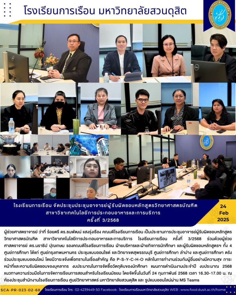 ว่าที่ ร.ต. ดร.ธนพัฒน์ แสงรุ่งเรือง คณบดีโรงเรียนการเรือน อ.ธิติมา แก้วมณี รองคณบดีฝ่ายวิชาการและการวางแผน ผศ.ดร.นราธิป ปุณเกษม รองคณบดี ฝ่ายบริหารและกิจการนักศึกษา และ คุณรณิดา ศรีธนาวรุณ หัวหน้าสำนักงานโรงเรียนการเรือน ประชุมหารือร่วมกับบริษัท ไทย อกริ ฟู้ดส์ จำกัด (มหาชน) และ บริษัท RICH’S เพื่อหารือความร่วมมือในด้านมอบผลัตภัณฑ์อาหาร เพื่อสนับสนุนการจัดการเรียนการสอนและการจัดอบรมให้กับนักศึกษาโรงเรียนการเรือน ซึ่งจัดประชุมเมื่อวันที่ 23 สิงหาคม 2567 ณ ห้องประชุมสำนักงานโรงเรียนการเรือน ศูนย์วิทยาศาสตร์ มหาวิทยาลัยสวนดุสิต
