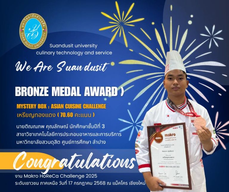 ขอแสดงความยินดีกับ ทีม The Charm of food นางสาวภาวิดา ศรีบุญขำ และนางสาวปภัสรา สมบูรณ์เทศ นักศึกษาชั้นปีที่ 1 สาขาเทคโนโลยีการประกอบอาหารและการบริการ ได้รับรางวัลรองชนะเลิศอันดับ 1 พร้อมเงินรางวัล 20,000 บาท ในการแข่งขัน THAILND’S NEXTCULNARY STAR 2024 ภายใต้ Concept idea “Fusion of Japanese Flavors ผสมผสานรสชาติสไตล์ญี่ปุ่น วันที่ 24 พฤศจิกายน 2567 ณ The Food School Bangkok