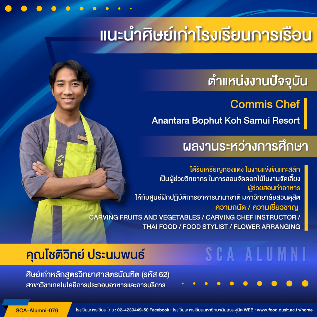 - ผู้ช่วยสอนทำอาหารให้กับศูนย์ฝึกปฏิบัติการอาหารนานาชาติ มหาวิทยาลัยสวนดุสิต