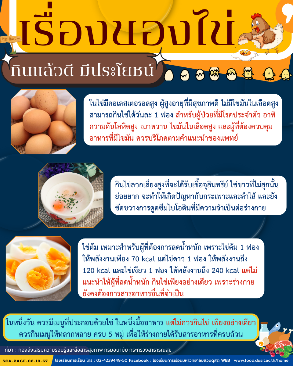 “ในหนึ่งวัน ควรมีเมนูที่ประกอบด้วยไข่ ในหนึ่งมื้ออาหาร แต่มึควรกินไข่ เพียงอย่างเดียว ควรกินเมนูให้หลากหลาย ครบ 5 หมู่ เพื่อให้ร่างกายได้รับสารอาหารที่ครบถ้วน”