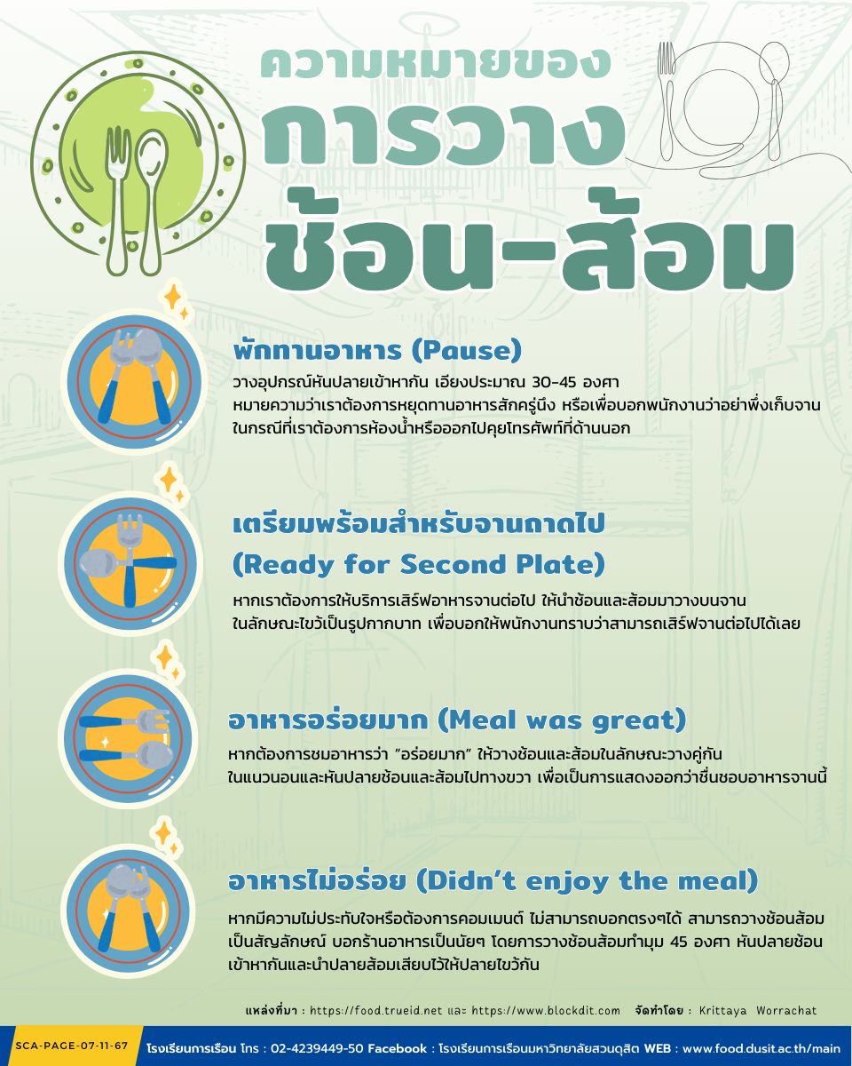 สามารถบ่งบอกความหมายได้หลากหลาย โดยที่เราไม่ต้องเอ่ยปากบอกพนักงานเสิร์ฟ ซึ่งถือได้ว่าเป็นมารยาทบนโต๊ะที่ควรเรียนรู้ ลองนำไปใช้กันดูนะคะ![]()