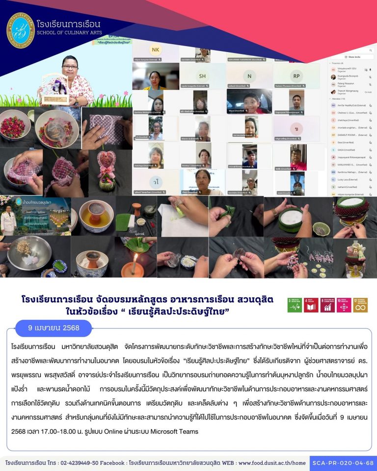 ผศ. ว่าที่ ร.ต. ดร.ธนพัฒน์ แสงรุ่งเรือง คณบดีโรงเรียนการเรือน ผศ.ดร.นราธิป ปุณเกษม รองคณบดี ฝ่ายบริหารและกิจการนักศึกษา และ คุณรณิดา ศรีธนาวรุณ หัวหน้าสำนักงานโรงเรียนการเรือน ประชุมหารือร่วมกับ คุณพงษ์สานต์ เสริมภัทรชัย R&D Director และทีมพัฒนาผลิตภัณฑ์ของบริษัท โออิชิ เทรดดิ้ง จำกัด เรื่องการพัฒนาผลิตภัณฑ์อาหารจาก Food Waste รวมถึงแนวทางการจัดทำความร่วมมือด้านวิชาการ การวิจัยและพัฒนาผลิตภัณฑ์อาหารร่วมกัน จัดขึ้นเมื่อวันที่ 23 มกราคม 2568 ณ ห้องประชุมสำนักงานโรงเรียนการเรือน ศูนย์วิทยาศาสตร์ มหาวิทยาลัยสวนดุสิต