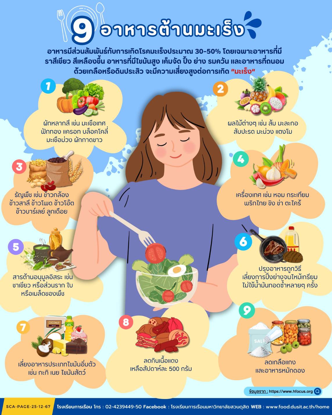 อาหารมีส่วนสัมพันธ์กับการเกิดโรคมะเร็งประมาณ 30-50% โดยเฉพาะอาหารที่มีราสีเขียว สีเหลืองขึ้น อาหารที่มีไขมันสูง เค็มจัด ปิ้ง ย่าง รมควัน และอาหารที่ถนอมด้วยเกลือหรือดินประสิว จะมีความเสี่ยงสูงต่อการเกิด “มะเร็ง”