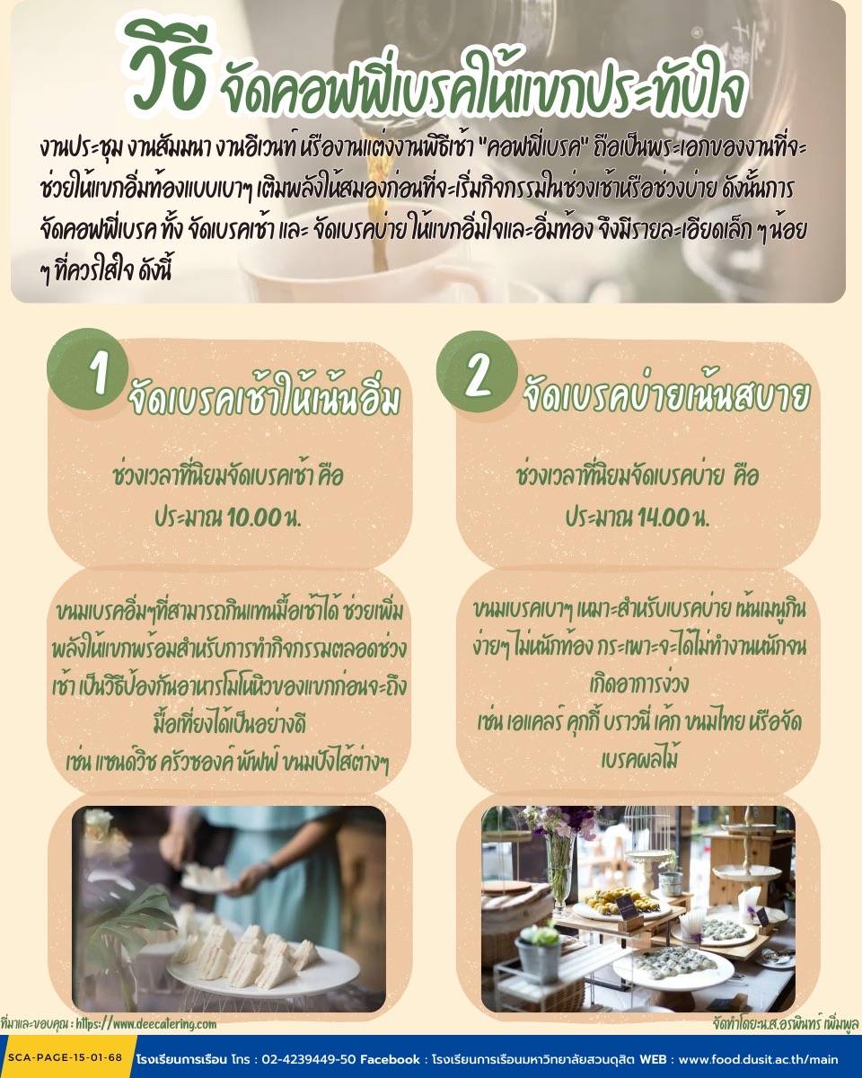 งานประชุม งานสัมมนา งานอีเวนท์ หรืองานแต่งงานพิธีเช้า “คอฟฟี่เบรค” ถือเป็นพระเอกของงานที่จะช่วยให้แขกอิ่มท้องแบบเบาๆ เติมพลังให้สมองก่อนที่จะเริ่มกิจกรรมในช่วงเช้าหรือช่วงบ่าย ดังนั้นการจัดคอฟฟี่เบรค ทั้ง จัดเบรคเช้า และ จัดเบรคบ่าย ให้แขกอิ่มใจและอิ่มท้อง จึงมีรายละเอียดเล็ก ๆ น้อย ๆ ที่ควรใส่ใจ