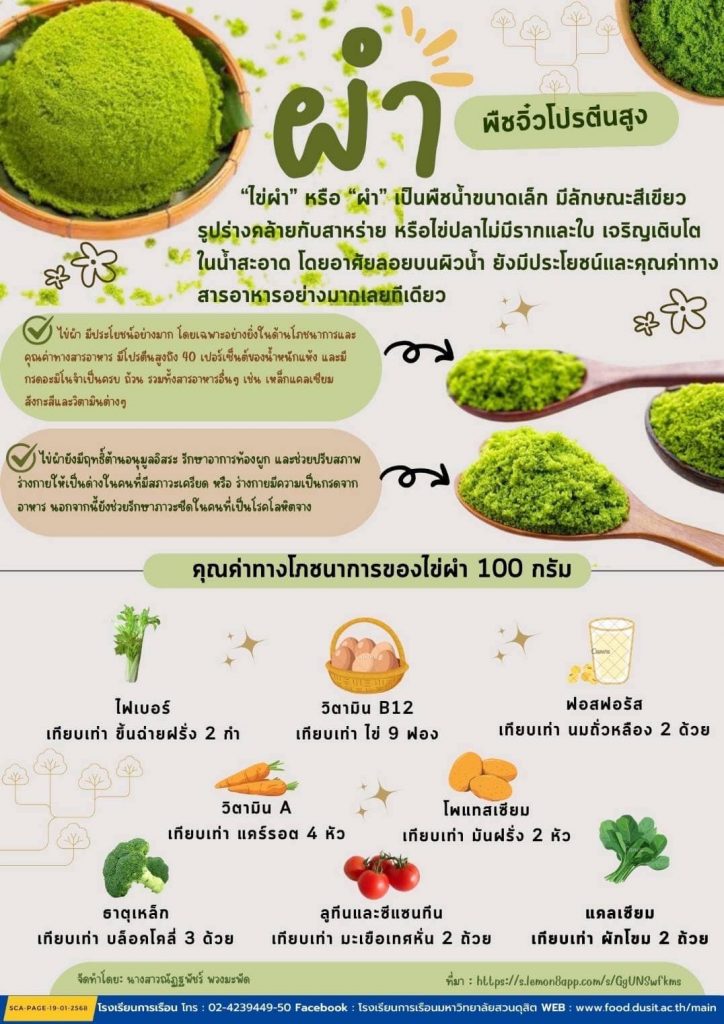 “ไข่ผำ” หรือ “ผำ” เป็นพืชน้ำขนาดเล็ก มีลักษณะสีเขียว รูปร่างคล้ายกับสาหร่าย หรือไข่ปลาไม่มีรากและใบ เจริญเติบโตในน้ำสะอาด โดยอาศัยลอยบนผิวน้ำ ยังมีประโยชน์และคุณค่าทางสารอาหารอย่างมาก