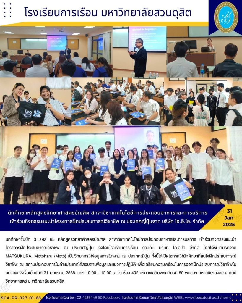 นักศึกษาชั้นปีที่ 3 รหัส 65 หลักสูตรวิทยาศาสตรบัณฑิต สาขาวิชาเทคโนโลยีการประกอบอาหารและการบริการ เข้าร่วมกิจกรรมแนะนำโครงการฝึกประสบการณ์วิชาชีพ ณ ประเทศญี่ปุ่น จัดโดยโรงเรียนการเรือน ร่วมกับ บริษัท ไอ.อี.โอ จำกัด โดยได้รับเกียรติจาก MATSUKURA, Motoharu (Moto) เป็นวิทยากรให้ข้อมูลการฝึกงาน ณ ประเทศญี่ปุ่น ทั้งนี้ได้เปิดโอกาสให้นักศึกษาที่สนใจฝึกประสบการณ์วิชาชีพ ณ สถานประกอบการในต่างประเทศได้สอบถามข้อมูลและแนวทางปฏิบัติ เพื่อเตรียมความพร้อมในการออกฝึกประสบการณ์วิชาชีพในอนาคต จัดขึ้นเมื่อวันที่ 31 มกราคม 2568 เวลา 10.00 – 12.00 น. ณ ห้อง 402 อาคารเฉลิมพระเกียรติ 50 พรรษา มหาวชิราลงกรณ ศูนย์วิทยาศาสตร์ มหาวิทยาลัยสวนดุสิต