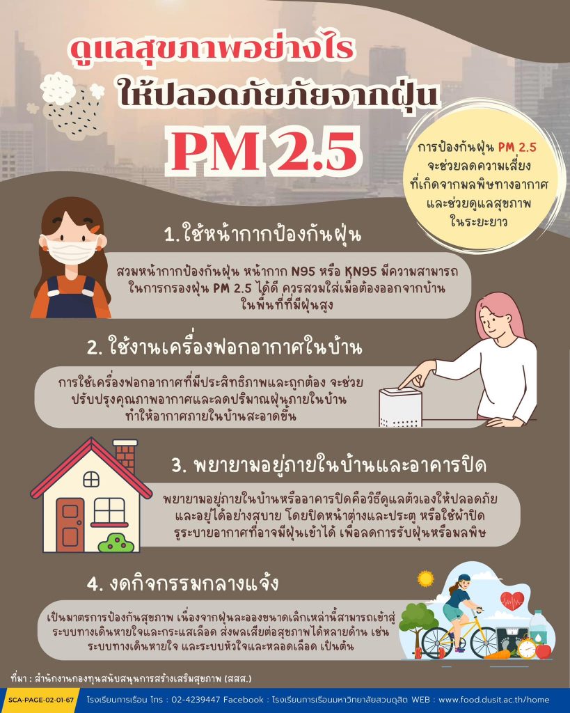 4. งดกิจกรรมกลางแจ้ง เป็นมาตรการป้องกันสุขภาพ เนื่องจากฝุ่นละอองขนาดเล็กเหล่านี้สามารถเข้าสู่ระบบทางเดินหายใจและกระแสเลือด ส่งผลเสียต่อสุขภาพได้หลายด้าน เช่น ระบบทางเดินหายใจ และระบบหัวใจและหลอดเลือด เป็นต้น