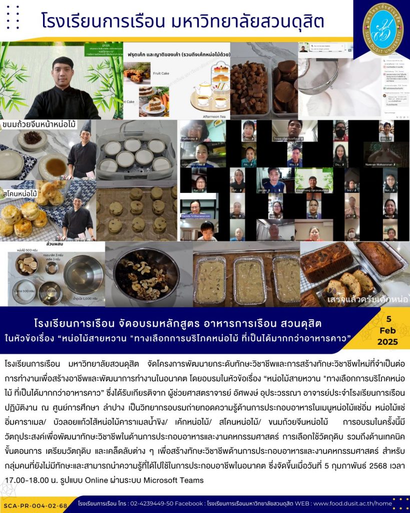 โรงเรียนการเรือน มหาวิทยาลัยสวนดุสิต จัดโครงการพัฒนายกระดับทักษะวิชาชีพและการสร้างทักษะวิชาชีพใหม่ที่จำเป็นต่อการทำงานเพื่อสร้างอาชีพและพัฒนาการทำงานในอนาคต โดยอบรมในหัวข้อเรื่อง “หน่อไม้สายหวาน “ทางเลือกการบริโภคหน่อไม้ ที่เป็นได้มากกว่าอาหารคาว” ซึ่งได้รับเกียรติจาก ผู้ช่วยศาสตราจารย์ อัศพงษ์ อุประวรรณา อาจารย์ประจำโรงเรียนการเรือน ปฏิบัติงาน ณ ศูนย์การศึกษา ลำปาง เป็นวิทยากรอบรมถ่ายทอดความรู้ด้านการประกอบอาหารในเมนูหน่อไม้แช่อิ่ม หน่อไม้แช่อิ่มคาราเมล/ บัวลอยแก้วไส้หน่อไม้คาราเมลน้ำขิง/ เค้กหน่อไม้/ สโคนหน่อไม้/ ขนมถ้วยจีนหน่อไม้ การอบรมในครั้งนี้มีวัตถุประสงค์เพื่อพัฒนาทักษะวิชาชีพในด้านการประกอบอาหารและงานคหกรรมศาสตร์ การเลือกใช้วัตถุดิบ รวมถึงด้านเทคนิคขั้นตอนการ เตรียมวัตถุดิบ และเคล็ดลับต่าง ๆ เพื่อสร้างทักษะวิชาชีพด้านการประกอบอาหารและงานคหกรรมศาสตร์ สำหรับกลุ่มคนที่ยังไม่มีทักษะและสามารถนำความรู้ที่ได้ไปใช้ในการประกอบอาชีพในอนาคต ซึ่งจัดขึ้นเมื่อวันที่ 5 กุมภาพันธ์ 2568 เวลา 17.00-18.00 น. รูปแบบ Online ผ่านระบบ Microsoft Teams