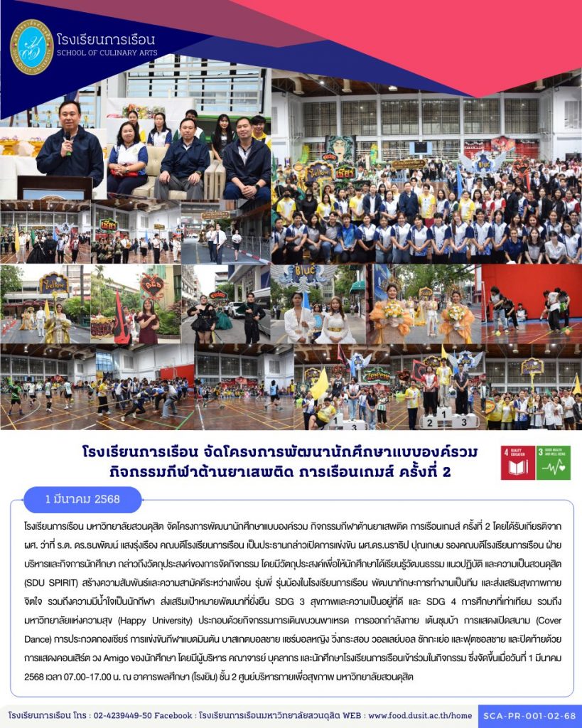 โรงเรียนการเรือน มหาวิทยาลัยสวนดุสิต จัดโครงการพัฒนานักศึกษาแบบองค์รวม กิจกรรมกีฬาต้านยาเสพติด การเรือนเกมส์ ครั้งที่ 2 โดยได้รับเกียรติจาก ผศ. ว่าที่ ร.ต. ดร.ธนพัฒน์ แสงรุ่งเรือง คณบดีโรงเรียนการเรือน เป็นประธานกล่าวเปิดการแข่งขัน ผศ.ดร.นราธิป ปุณเกษม รองคณบดีโรงเรียนการเรือน ฝ่ายบริหารและกิจการนักศึกษา กล่าวถึงวัตถุประสงค์ของการจัดกิจกรรม โดยมีวัตถุประสงค์เพื่อให้นักศึกษาได้เรียนรู้วัฒนธรรม แนวปฏิบัติ และความเป็นสวนดุสิต (SDU SPIRIT) สร้างความสัมพันธ์และความสามัคคีระหว่างเพื่อน รุ่นพี่ รุ่นน้องในโรงเรียนการเรือน พัฒนาทักษะการทำงานเป็นทีม และส่งเสริมสุขภาพกาย จิตใจ รวมถึงความมีน้ำใจเป็นนักกีฬา ส่งเสริมเป้าหมายพัฒนาที่ยั่งยืน SDG 3 สุขภาพและความเป็นอยู่ที่ดี และ SDG 4 การศึกษาที่เท่าเทียม รวมถึงมหาวิทยาลัยแห่งความสุข (Happy University) ประกอบด้วยกิจกรรมการเดินขบวนพาเหรด การออกกำลังกาย เต้นซุมบ้า การแสดงเปิดสนาม (Cover Dance) การประกวดกองเชียร์ การแข่งขันกีฬาแบดมินตัน บาสเกตบอลชาย แชร์บอลหญิง วิ่งกระสอบ วอลเลย์บอล ชักกะเย่อ และฟุตซอลชาย และปิดท้ายด้วยการแสดงคอนเสิร์ต วง Amigo ของนักศึกษา โดยมีผู้บริหาร คณาจารย์ บุคลากร และนักศึกษาโรงเรียนการเรือนเข้าร่วมในกิจกรรม ซึ่งจัดขึ้นเมื่อวันที่ 1 มีนาคม 2568 เวลา 07.00-17.00 น. ณ อาคารพลศึกษา (โรงยิม) ชั้น 2 ศูนย์บริหารกายเพื่อสุขภาพ มหาวิทยาลัยสวนดุสิต