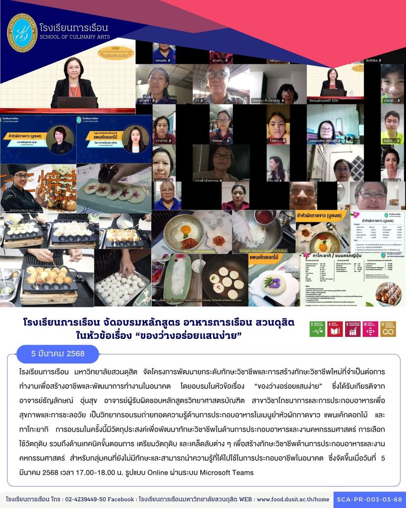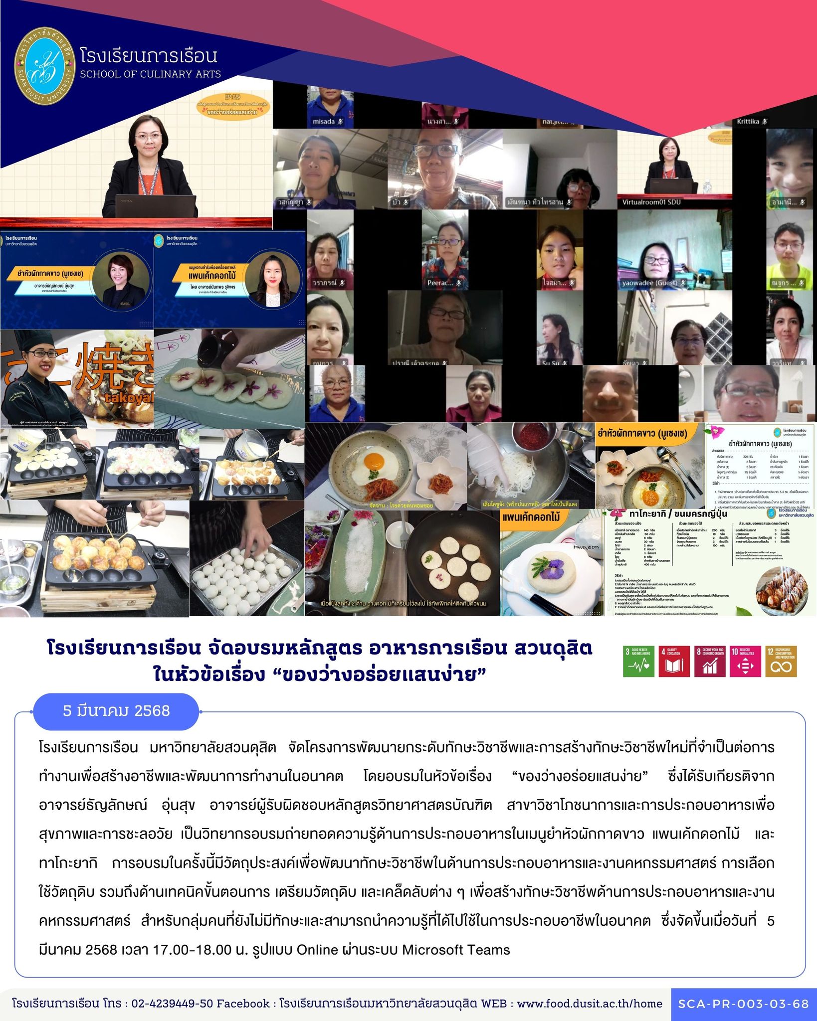 โรงเรียนการเรือน มหาวิทยาลัยสวนดุสิต จัดโครงการพัฒนายกระดับทักษะวิชาชีพและการสร้างทักษะวิชาชีพใหม่ที่จำเป็นต่อการทำงานเพื่อสร้างอาชีพและพัฒนาการทำงานในอนาคต โดยอบรมในหัวข้อเรื่อง “ของว่างอร่อยแสนง่าย” ซึ่งได้รับเกียรติจาก อาจารย์ธัญลักษณ์ อุ่นสุข อาจารย์ผู้รับผิดชอบหลักสูตรวิทยาศาสตรบัณฑิต สาขาวิชาโภชนาการและการประกอบอาหารเพื่อสุขภาพและการชะลอวัย เป็นวิทยากรอบรมถ่ายทอดความรู้ด้านการประกอบอาหารในเมนูยำหัวผักกาดขาว แพนเค้กดอกไม้ และทาโกะยากิ การอบรมในครั้งนี้มีวัตถุประสงค์เพื่อพัฒนาทักษะวิชาชีพในด้านการประกอบอาหารและงานคหกรรมศาสตร์ การเลือกใช้วัตถุดิบ รวมถึงด้านเทคนิคขั้นตอนการ เตรียมวัตถุดิบ และเคล็ดลับต่าง ๆ เพื่อสร้างทักษะวิชาชีพด้านการประกอบอาหารและงานคหกรรมศาสตร์ สำหรับกลุ่มคนที่ยังไม่มีทักษะและสามารถนำความรู้ที่ได้ไปใช้ในการประกอบอาชีพในอนาคต ซึ่งจัดขึ้นเมื่อวันที่ 5 มีนาคม 2568 เวลา 17.00-18.00 น. รูปแบบ Online ผ่านระบบ Microsoft Teams