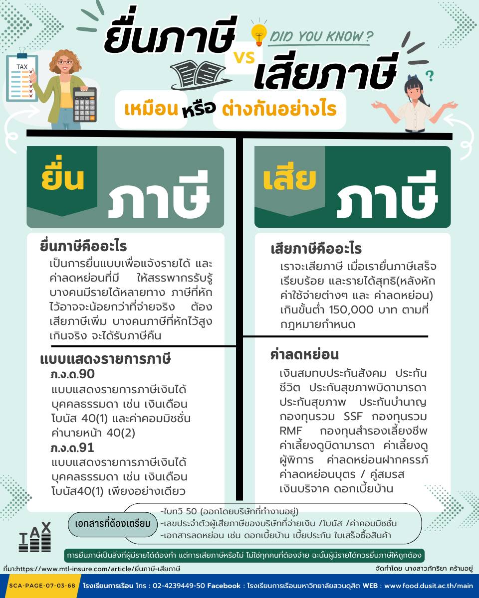*ยื่นภาษี* เป็นการยื่นแบบเพื่อแจ้งรายได้และค่าลดหย่อนที่มี ให้กับสรรพากรรับรู้ บางคนมีรายได้หลายทาง ภาษีที่หักไว้อาจจะน้อยกว่าที่จ่ายจริง ต้องเสียภาษีเพิ่ม หรือบางคนภาษีที่หักไว้สูงเกินจริง จะได้รับภาษีคืน