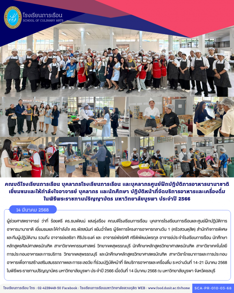 ผู้ช่วยศาสตราจารย์ ว่าที่ ร้อยตรี ดร.ธนพัฒน์ แสงรุ่งเรือง คณบดีโรงเรียนการเรือน บุคลากรโรงเรียนการเรือนและศูนย์ฝึกปฏิบัติการอาหารนานาชาติ เยี่ยมชมและให้กำลังใจ ดร.พัสสนันท์ แย้มฉ่ำไพร ผู้จัดการโครงการอาหารกลางวัน 1 (ครัวสวนดุสิต) สำนักกิจการพิเศษ และทีมผู้ปฏิบัติงาน รวมถึง อาจารย์ชลธิชา ศิริประยงค์ และ อาจารย์พัชร์ศศิ ศรีพิพัฒน์พรกุล อาจารย์ประจำโรงเรียนการเรือน นักศึกษาหลักสูตรศิลปศาสตรบัณฑิต สาขาวิชาคหกรรมศาสตร์ วิทยาเขตสุพรรณบุรี นักศึกษาหลักสูตรวิทยาศาสตรบัณฑิต สาขาวิชาเทคโนโลยีการประกอบอาหารและการบริการ วิทยาเขตสุพรรณบุรี และนักศึกษาหลักสูตรวิทยาศาสตรบัณฑิต สาขาวิชาโภชนาการและการประกอบอาหารเพื่อการสร้างเสริมสมรรถภาพและการชะลอวัย ที่ร่วมปฏิบัติหน้าที่ิ จัดบริการอาหารและเครื่องดื่ม ระหว่างวันที่ 14-21 มีนาคม 2568 ในพิธีพระราชทานปริญญาบัตร มหาวิทยาลัยบูรพา ประจำปี 2566 เมื่อวันที่ 14 มีนาคม 2568 ณ มหาวิทยาลัยบูรพา จังหวัดชลบุรี