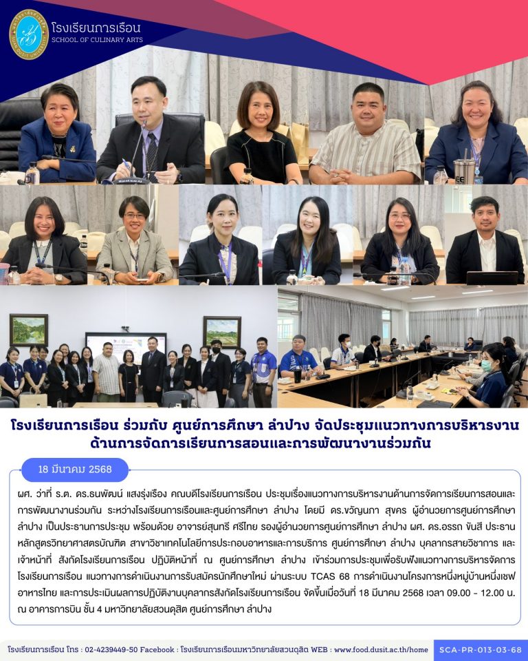 ผศ. ว่าที่ ร.ต. ดร.ธนพัฒน์ แสงรุ่งเรือง คณบดีโรงเรียนการเรือน พบนักศึกษาเพื่อพูดคุยรับฟังข้อคิดเห็นจากนักศึกษา ในด้านการเรียนการสอน การพัฒนานักศึกษา การใช้ชีวิต และส่งมอบชุดปฏิบัติงานและชุดอุปกรณ์ สำหรับการเรียนปฏิบัติการทางอาหาร ให้แก่นักศึกษาหลักสูตรวิทยาศาสตรบัณฑิต สาขาวิชาเทคโนโลยีการประกอบอาหารและการบริการ ศูนย์การศึกษา ลำปาง ชั้นปีที่ 1 (รหัส 67) ชั้นปีที่ 2 (รหัส 66) และชั้นปีที่ 3 (รหัส 65) จัดขึ้นเมื่อวันที่ 18 มีนาคม 2568 เวลา 13.00 – 14.00 น. ณ หอประชุมอาคารนานาชาติ ชั้น 2 ศูนย์การศึกษา ลำปาง มหาวิทยาลัยสวนดุสิต