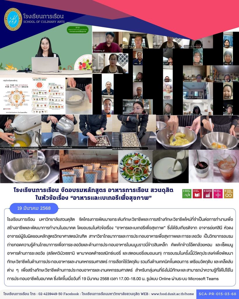 โรงเรียนการเรือน มหาวิทยาลัยสวนดุสิต จัดโครงการพัฒนายกระดับทักษะวิชาชีพและการสร้างทักษะวิชาชีพใหม่ที่จำเป็นต่อการทำงานเพื่อสร้างอาชีพและพัฒนาการทำงานในอนาคต โดยอบรมในหัวข้อเรื่อง “อาหารและเบเกอรีเพื่อสุขภาพ” ซึ่งได้รับเกียรติจาก อาจารย์ยศสินี หัวดง อาจารย์ผู้รับผิดชอบหลักสูตรวิทยาศาสตรบัณฑิต สาขาวิชาโภชนาการและการประกอบอาหารเพื่อสุขภาพและการชะลอวัย เป็นวิทยากรอบรมถ่ายทอดความรู้ด้านโภชนาการเพื่อการชะลอวัยและด้านการประกอบอาหารในเมนูบราวนี่ข้าวสินเหล็ก คัพเค้กข้าวโอ๊ตกล้วยหอม และเซ็ตเมนูอาหารต้านการชะลอวัย (สลัดควินัวเซซามิ พานาคอตต้าซอสมิกซ์เบอรี่ และสตอเบอรี่เลมอนเนท) การอบรมในครั้งนี้มีวัตถุประสงค์เพื่อพัฒนาทักษะวิชาชีพในด้านการประกอบอาหารและงานคหกรรมศาสตร์ การเลือกใช้วัตถุดิบ รวมถึงด้านเทคนิคขั้นตอนการ เตรียมวัตถุดิบ และเคล็ดลับต่าง ๆ เพื่อสร้างทักษะวิชาชีพด้านการประกอบอาหารและงานคหกรรมศาสตร์ สำหรับกลุ่มคนที่ยังไม่มีทักษะและสามารถนำความรู้ที่ได้ไปใช้ในการประกอบอาชีพในอนาคต ซึ่งจัดขึ้นเมื่อวันที่ 19 มีนาคม 2568 เวลา 17.00-18.00 น. รูปแบบ Online ผ่านระบบ Microsoft Teams