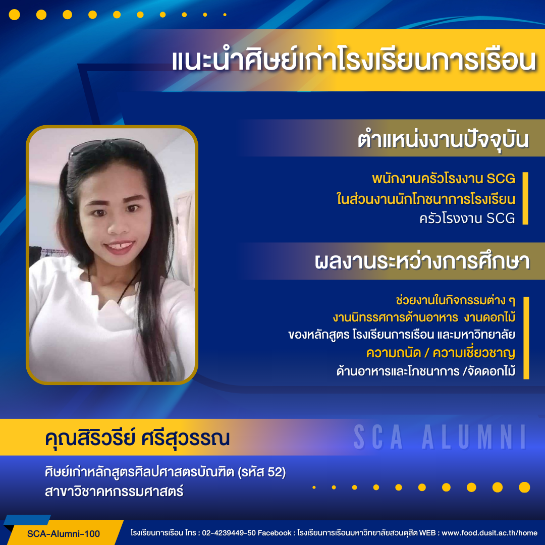 แนะนำศิษย์เก่าของโรงเรียนการเรือน รหัส 52 คุณสิริวรีย์ ศรีสุวรรณ
