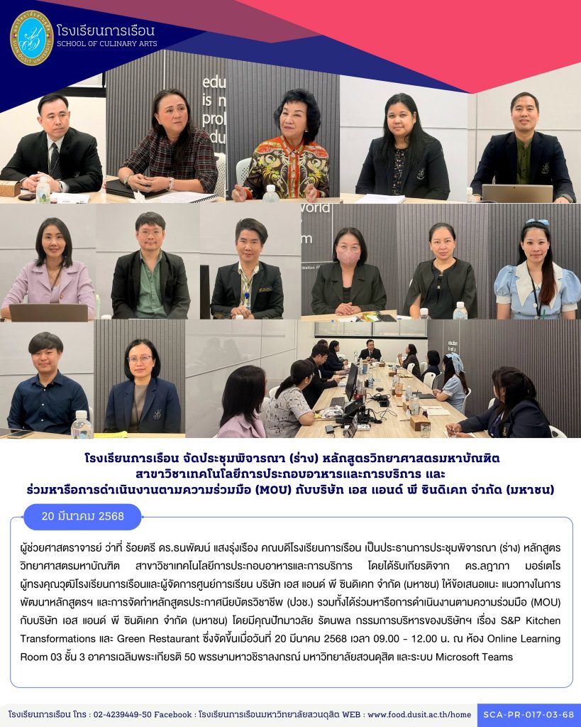 ผู้ช่วยศาสตราจารย์ ว่าที่ ร้อยตรี ดร.ธนพัฒน์ แสงรุ่งเรือง คณบดีโรงเรียนการเรือน เป็นประธานการประชุมพิจารณา (ร่าง) หลักสูตรวิทยาศาสตรมหาบัณฑิต สาขาวิชาเทคโนโลยีการประกอบอาหารและการบริการ โดยได้รับเกียรติจาก ดร.ลฎาภา มอร์เตโร ผู้ทรงคุณวุฒิโรงเรียนการเรือนและผู้จัดการศูนย์การเรียน บริษัท เอส แอนด์ พี ซินดิเคท จำกัด (มหาชน) ให้ข้อเสนอแนะ แนวทางในการพัฒนาหลักสูตรฯ และการจัดทำหลักสูตรประกาศนียบัตรวิชาชีพ (ปวช.) รวมทั้งได้ร่วมหารือการดำเนินงานตามความร่วมมือ (MOU) กับบริษัท เอส แอนด์ พี ซินดิเคท จำกัด (มหาชน) โดยมีคุณปัทมาวลัย รัตนพล กรรมการบริหารของบริษัทฯ เรื่อง S&P Kitchen Transformations และ Green Restaurant ซึ่งจัดขึ้นเมื่อวันที่ 20 มีนาคม 2568 เวลา 09.00 – 12.00 น. ณ ห้อง Online Learning Room 03 ชั้น 3 อาคารเฉลิมพระเกียรติ 50 พรรษามหาวชิราลงกรณ์ มหาวิทยาลัยสวนดุสิต และระบบ Microsoft Teams