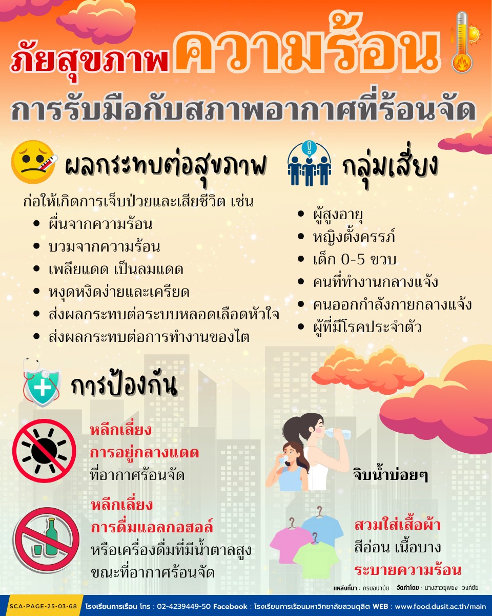 (sun) คลื่นความร้อนไม่ใช่แค่เรื่องเล็ก ๆ ความร้อนและความชื้นที่มากเกินไปอาจทำให้รู้สึกไม่สบายและสามารถเป็นอันตรายต่อสุขภาพ โดยเฉพาะอย่างยิ่งต่อทารก เด็ก สตรีมีครรภ์ และผู้สูงอายุ ความร้อนที่มากเกินไปส่งผลกระทบต่อสุขภาพอาจก่อให้เกิดการเจ็บป่วยและเสียชีวิต เช่น ผื่นจากความร้อน บวมจากความร้อน เพลียแดด ลมแดด หงุดหงิดง่าย และเครียด