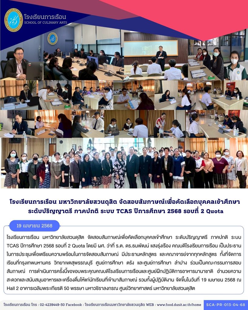 โรงเรียนการเรือน มหาวิทยาลัยสวนดุสิต จัดสอบสัมภาษณ์เพื่อคัดเลือกบุคคลเข้าศึกษา ระดับปริญญาตรี ภาคปกติ ระบบ TCAS ปีการศึกษา 2568 รอบที่ 2 Quota โดยมี ผศ. ว่าที่ ร.ต. ดร.ธนพัฒน์ แสงรุ่งเรือง คณบดีโรงเรียนการเรือน เป็นประธานในการประชุมเพื่อเตรียมความพร้อมในการจัดสอบสัมภาษณ์ มีประธานหลักสูตร และคณาจารย์จากทุกหลักสูตร ทั้งที่จัดการเรียนที่กรุงเทพมหานคร วิทยาเขตสุพรรณบุรี ศูนย์การศึกษา ตรัง และศูนย์การศึกษา ลำปาง ร่วมเป็นคณะกรรมการสอบสัมภาษณ์ การดำเนินการครั้งนี้ขอขอบพระคุณคณบดีโรงเรียนการเรือนและศูนย์ฝึกปฏิบัติการอาหารนานาชาติ อำนวยความสะดวกและสนับสนุนอาหารและเครื่องดื่มให้แก่นักเรียนที่เข้ามาสัมภาษณ์ รวมทั้งผู้ปฏิบัติงาน จัดขึ้นในวันที่ 19 เมษายน 2568 ณ Hall 2 อาคารเฉลิมพระเกียรติ 50 พรรษา มหาวชิราลงกรณ ศูนย์วิทยาศาสตร์ มหาวิทยาลัยสวนดุสิต