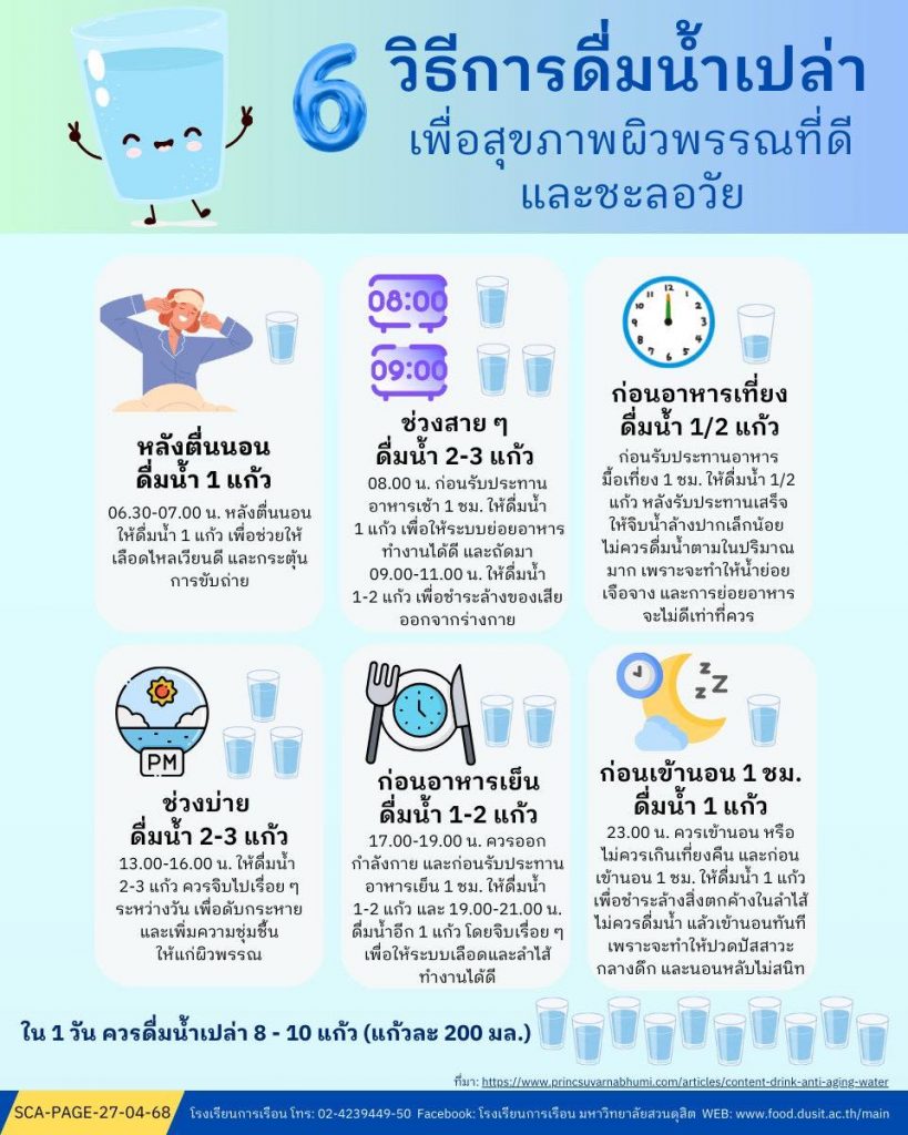 การดื่มน้ำเปล่าสะอาดอย่างน้อย 8-10 แก้ว/วัน ทำให้ระบบเมตาบอลิซึมของร่างกายทำงานได้ดี และช่วยเรื่องผิวพรรณ ระบบการย่อยอาหาร และระบบการขับถ่าย จะทำงานได้อย่างมีประสิทธิภาพ ช่วยชะลอวัย และยังช่วยลดน้ำหนักได้อีกต่างหาก และหากดื่มน้ำได้ตาม 6 วิธีด้านล่างนี้ สุขภาพดีก็จะอยู่ใกล้แค่เอื้อม แต่ทั้งนี้ทั้งนั้นต้องรับประทานอาหารให้ครบ 5 หมู่ ด้วยค่ะ .. 6 วิธีการดื่มน้ำเปล่าเพื่อสุขภาพ ฯ มีดังนี้