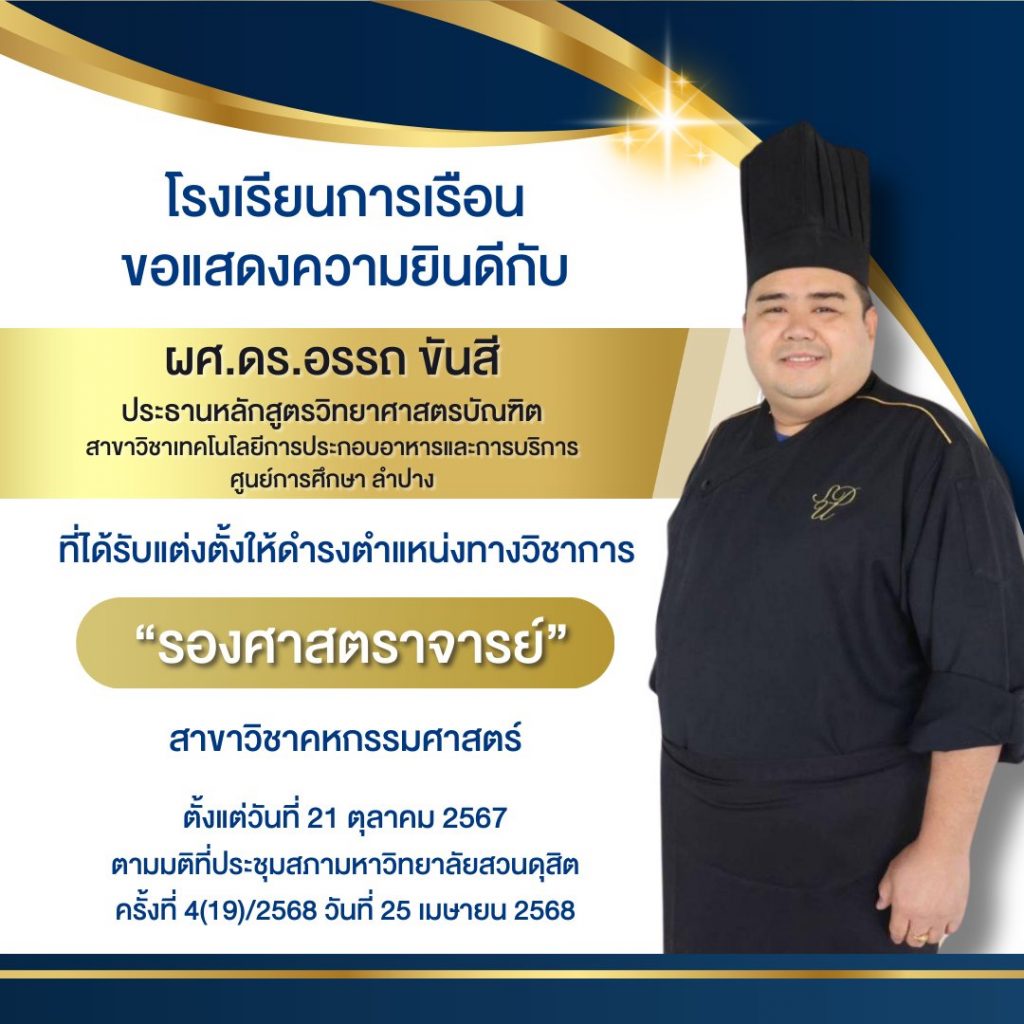 โรงเรียนการเรือน ขอแสดงความยินดีกับผู้ช่วยศาสตราจารย์ ดร.อรรถ ขันสี ที่ได้รับแต่งตั้งให้ดำรงตำแหน่งทางวิชาการ “รองศาสตราจารย์”