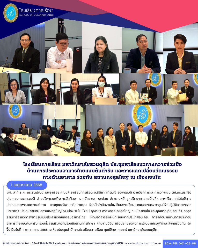 โดยมี ผศ. ว่าที่ ร.ต. ดร.ธนพัฒน์ แสงรุ่งเรือง คณบดีโรงเรียนการเรือน อ.ธิติมา แก้วมณี รองคณบดี ฝ่ายวิชาการและการวางแผน ผศ.ดร.นราธิป ปุณเกษม รองคณบดี ฝ่ายบริหารและกิจการนักศึกษา ผศ.ฉัตรชนก บุญไชย ประธานหลักสูตรวิทยาศาสตรบัณฑิต สาขาวิชาเทคโนโลยีการประกอบอาหารและการบริการ และคุณรณิดา ศรีธนาวรุณ หัวหน้าสำนักงานโรงเรียนการเรือน และบุคลากรจากศูนย์ฝึกปฏิบัติการอาหารนานาชาติ ประชุมร่วมกับ สถานกงสุลใหญ่ ณ เมืองเจนไน โดยมี คุณรชา อารีพรรค กงสุลใหญ่ ณ เมืองเจนไน และคุณภาณุธัช รัศมิทัต กงสุล ร่วมหารือแนวทางขยายรูปแบบส่งเสริมวัฒนธรรมอาหารไทย ให้กับอาจารย์และนักเรียนจากประเทศอินเดีย การจัดอบรมด้านการประกอบอาหารไทยแบบต้นตำรับ รวมทั้งส่งเสริมความร่วมมือด้านการศึกษา ด้านงานวิจัย เพื่อประโยชน์ต่อการพัฒนาเศรษฐกิจและสังคมร่วมกัน จัดขึ้นเมื่อวันที่ 1 พฤษภาคม 2568 ณ ห้องประชุมสำนักงานโรงเรียนการเรือน ศูนย์วิทยาศาสตร์ มหาวิทยาลัยสวนดุสิต