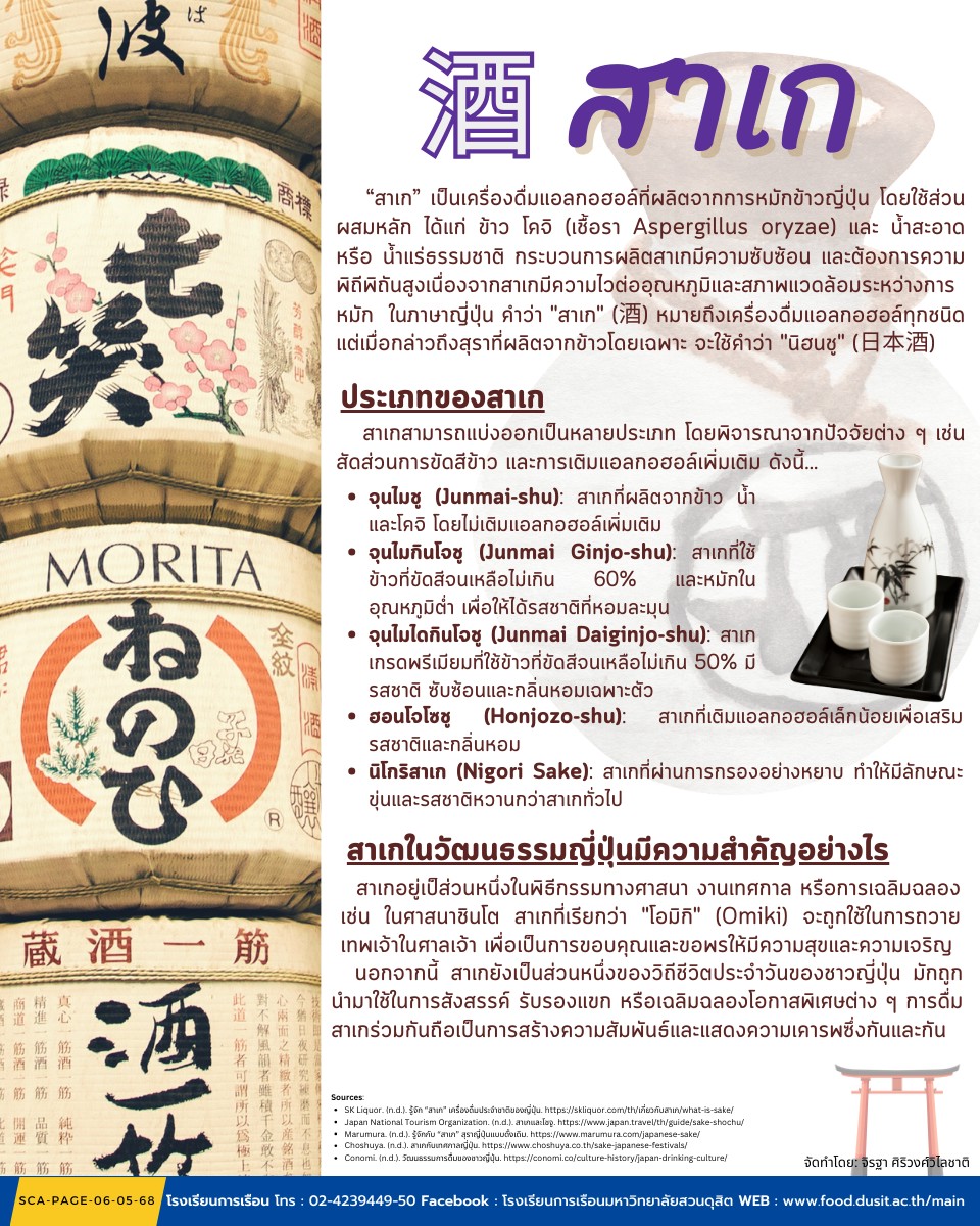 สาเกเป็นเครื่องดื่มแอลกอฮอล์ที่ผลิตจากการหมักข้าวของญี่ปุ่น โดยมีส่วนผสมหลักคือ ข้าว โคจิ และน้ำสะอาด กระบวนการผลิตต้องใช้ความพิถีพิถันและสะอาดมาก จึงทำให้สาเกเป็นสุราที่มีเอกลักษณ์เฉพาะตัว สาเกมีหลายประเภท เช่น จุนไมชู ที่ไม่เติมแอลกอฮอล์ ฮอนโจโซ ที่เติมแอลกอฮอล์เพื่อเพิ่มรสชาติ และนิโกริสาเกที่มีลักษณะขุ่นและรสหวาน นอกจากนี้ยังมีจุนไมกินโจและจุนไมไดกินโจ ซึ่งใช้ข้าวที่ขัดสีมากให้ได้รสชาตินุ่มละมุน สาเกยังมีบทบาทสำคัญในวัฒนธรรมญี่ปุ่น โดยเฉพาะในศาสนาชินโต เช่น การถวาย “โอมิกิ” ให้เทพเจ้า เพื่อขอพรให้มีความสุข ความเจริญ นอกจากนี้ยังใช้ในงานเทศกาล การรับรองแขก และการเฉลิมฉลองต่าง ๆ การดื่มสาเกร่วมกันถือเป็นการแสดงความเคารพและสร้างความสัมพันธ์ สะท้อนถึงวัฒนธรรมการอยู่ร่วมกันของชาวญี่ปุ่นอย่างลึกซึ้ง