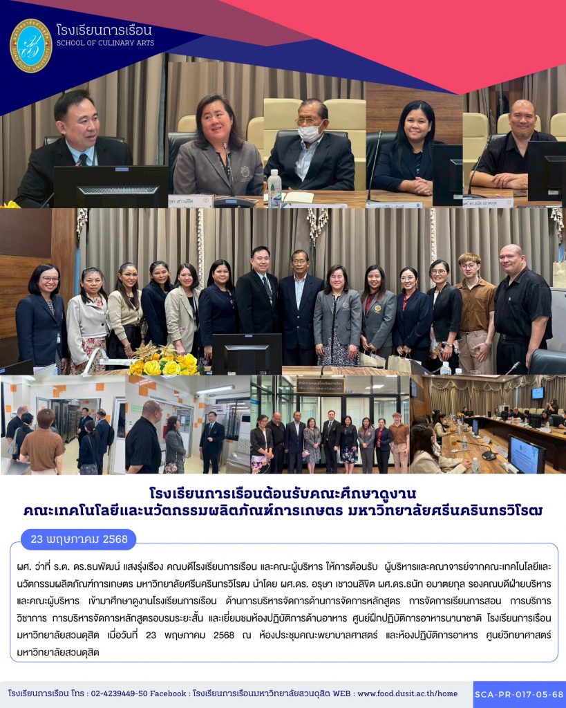 ผศ. ว่าที่ ร.ต. ดร.ธนพัฒน์ แสงรุ่งเรือง คณบดีโรงเรียนการเรือน และคณะผู้บริหาร ให้การต้อนรับผู้บริหารและคณาจารย์จากคณะเทคโนโลยีและนวัตกรรมผลิตภัณฑ์การเกษตร มหาวิทยาลัยศรีนครินทรวิโรฒ นำโดย ผศ.ดร. อรุษา เชาวนลิขิต ผศ.ดร.ธนัท อมาตยกุล รองคณบดีฝ่ายบริหาร และคณะผู้บริหาร เข้าเยี่ยมชมและศึกษาดูงานโรงเรียนการเรือน ด้านการบริหารจัดการด้านการจัดการหลักสูตร การจัดการเรียนการสอน การบริการวิชาการ การบริหารจัดการหลักสูตรอบรมระยะสั้น และเยี่ยมชมห้องปฏิบัติการด้านอาหาร ศูนย์ฝึกปฏิบัติการอาหารนานาชาติ โรงเรียนการเรือน มหาวิทยาลัยสวนดุสิต เมื่อวันที่ 23 พฤษภาคม 2568 ณ ห้องประชุมคณะพยาบาลศาสตร์ และห้องปฏิบัติการอาหาร ศูนย์วิทยาศาสตร์ มหาวิทยาลัยสวนดุสิต