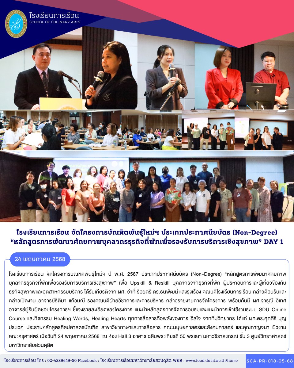 โรงเรียนการเรือน จัดโครงการบัณฑิตพันธุ์ใหม่ฯ ปี พ.ศ. 2567 ประเภทประกาศนียบัตร (Non-Degree) “หลักสูตรการพัฒนาศักยภาพบุคลากรธุรกิจที่พักเพื่อรองรับการบริการเชิงสุขภาพ” เพื่อ Upskill & Reskill บุคลากรจากธุรกิจที่พัก ผู้ประกอบการและผู้เกี่ยวข้องกับธุรกิจสุขภาพและอุตสาหกรรมบริการ ได้รับเกียรติจาก ผศ. ว่าที่ ร้อยตรี ดร.ธนพัฒน์ แสงรุ่งเรือง คณบดีโรงเรียนการเรือน กล่าวต้อนรับและกล่าวเปิดงาน อาจารย์ธิติมา แก้วมณี รองคณบดีฝ่ายวิชาการและการบริหาร กล่าวรายงานการจัดโครงการ พร้อมกันมี ผศ.จารุณี วิเทศอาจารย์ผู้รับผิดชอบโครงการฯ ชี้แจงรายละเอียดของโครงการ แนะนำหลักสูตรการจัดการอบรมและแนะนำการเข้าใช้งานระบบ SDU Online Course และกิจกรรม Healing Words, Healing Hearts ทุกการสื่อสารคือพลังของการ ฮีลใจ จากทีมวิทยากร ได้แก่ ผศ.ดร.ศุภศิริ บุญประเวศ ประธานหลักสูตรศิลปศาสตรบัณฑิต สาขาวิชาภาษาและการสื่อสาร คณะมนุษยศาสตร์และสังคมศาสตร์ และคุณกาญจนา ผิวงาม คณะครุศาสตร์ เมื่อวันที่ 24 พฤษภาคม 2568 ณ ห้อง Hall 3 อาคารเฉลิมพระเกียรติ 50 พรรษา มหาวชิราลงกรณ์ ชั้น 3 ศูนย์วิทยาศาสตร์ มหาวิทยาลัยสวนดุสิต