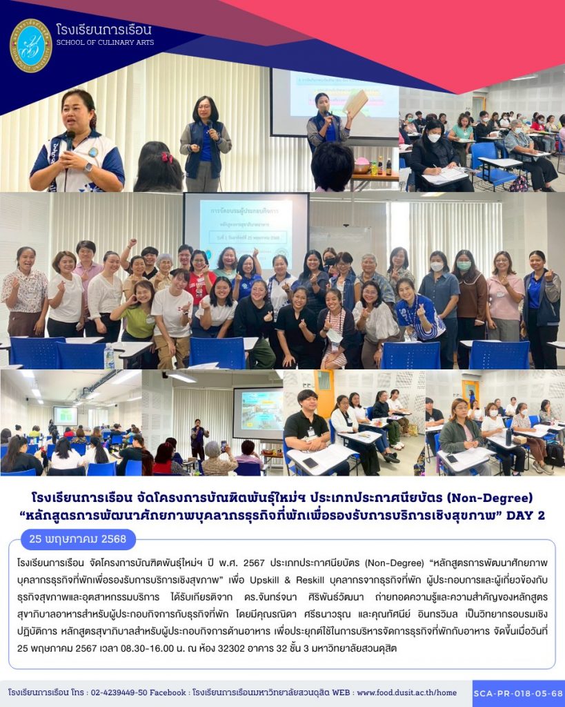โรงเรียนการเรือน จัดโครงการบัณฑิตพันธุ์ใหม่ฯ ปี พ.ศ. 2567 ประเภทประกาศนียบัตร (Non-Degree) “หลักสูตรการพัฒนาศักยภาพบุคลากรธุรกิจที่พักเพื่อรองรับการบริการเชิงสุขภาพ” เพื่อ Upskill & Reskill บุคลากรจากธุรกิจที่พัก ผู้ประกอบการและผู้เกี่ยวข้องกับธุรกิจสุขภาพและอุตสาหกรรมบริการ ได้รับเกียรติจาก ดร.จันทร์จนา ศิริพันธ์วัฒนา ถ่ายทอดความรู้และความสำคัญของหลักสูตรสุขาภิบาลอาหารสำหรับผู้ประกอบกิจการกับธุรกิจที่พัก โดยมีคุณรณิดา ศรีธนาวรุณ และคุณทัศนีย์ อินทรวิมล เป็นวิทยากรอบรมเชิงปฏิบัติการ หลักสูตรสุขาภิบาลสำหรับผู้ประกอบกิจการด้านอาหาร เพื่อประยุกต์ใช้ในการบริหารจัดการธุรกิจที่พักกับอาหาร จัดขึ้นเมื่อวันที่ 25 พฤษภาคม 2567 เวลา 08.30-16.00 น. ณ ห้อง 32302 อาคาร 32 ชั้น 3 มหาวิทยาลัยสวนดุสิต