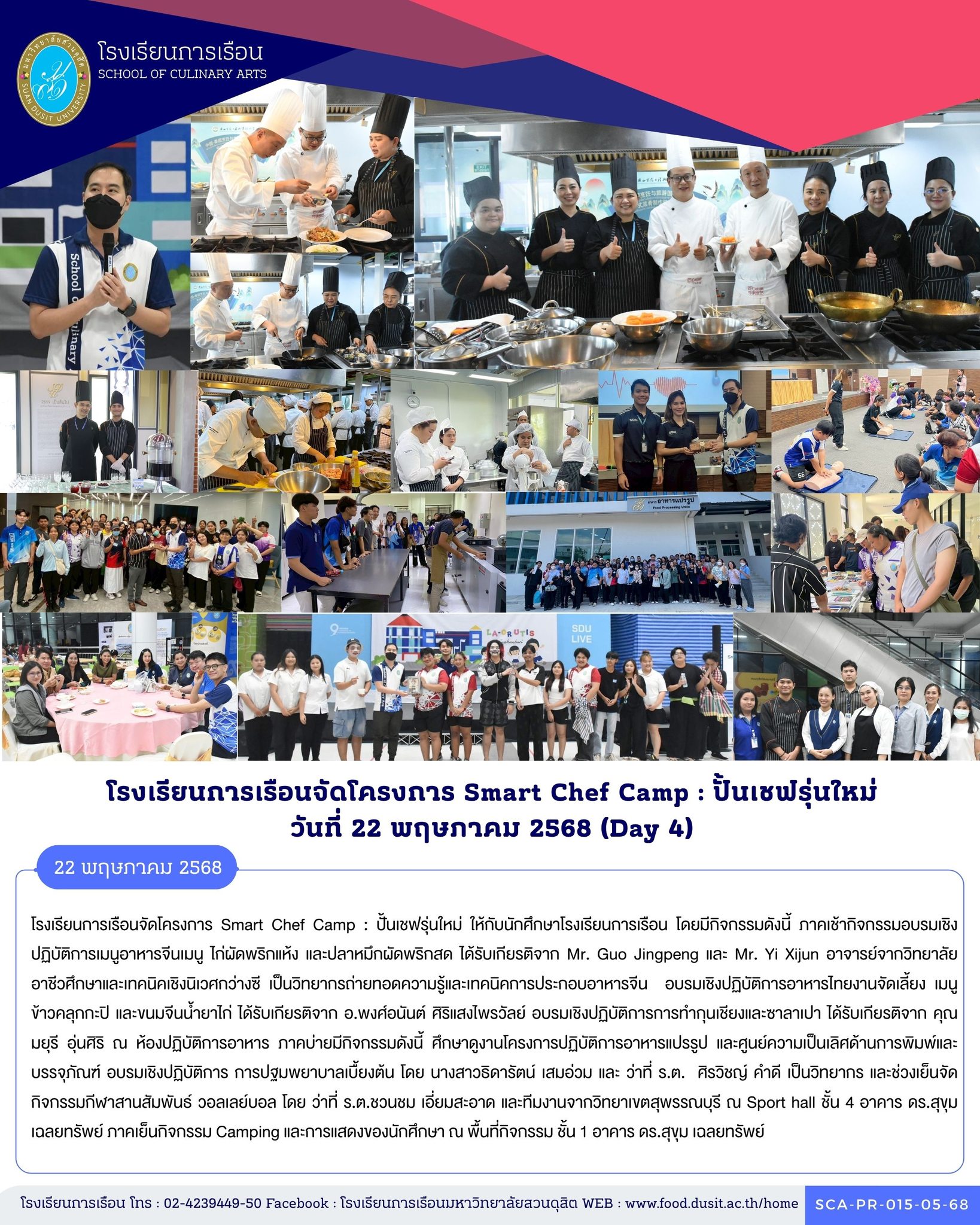 โรงเรียนการเรือนจัดโครงการ Smart Chef Camp : ปั้นเชฟรุ่นใหม่ ให้กับนักศึกษาโรงเรียนการเรือน โดยมีกิจกรรมดังนี้ ภาคเช้ากิจกรรมอบรมเชิงปฏิบัติการเมนูอาหารจีนเมนู ไก่ผัดพริกแห้ง และปลาหมึกผัดพริกสด ได้รับเกียรติจาก Mr. Guo Jingpeng และ Mr. Yi Xijun อาจารย์จากวิทยาลัยอาชีวศึกษาและเทคนิคเชิงนิเวศกว่างซี เป็นวิทยากรถ่ายทอดความรู้และเทคนิคการประกอบอาหารจีน อบรมเชิงปฏิบัติการอาหารไทยงานจัดเลี้ยง เมนู ข้าวคลุกกะปิ และขนมจีนน้ำยาไก่ ได้รับเกียรติจาก อ.พงศ์อนันต์ ศิริแสงไพรวัลย์ อบรมเชิงปฏิบัติการการทำกุนเชียงและซาลาเปา ได้รับเกียรติจาก คุณมยุรี อุ่นศิริ ณ ห้องปฏิบัติการอาหาร ภาคบ่ายมีกิจกรรมดังนี้ ศึกษาดูงานโครงการปฏิบัติการอาหารแปรรูป และศูนย์ความเป็นเลิศด้านการพิมพ์และบรรจุภัณฑ์ อบรมเชิงปฏิบัติการ การปฐมพยาบาลเบื้ยงต้น โดย นางสาวธิดารัตน์ เสมอ่วม และ ว่าที่ ร.ต. ศิรวิชญ์ คำดี เป็นวิทยากร และช่วงเย็นจัดกิจกรรมกีฬาสานสัมพันธ์ วอลเลย์บอล โดย ว่าที่ ร.ต.ชวนชม เอี่ยมสะอาด และทีมงานจากวิทยาเขตสุพรรณบุรี ณ Sport hall ชั้น 4 อาคาร ดร.สุขุม เฉลยทรัพย์ ภาคเย็นกิจกรรม Camping และการแสดงของนักศึกษา ณ พื้นที่กิจกรรม ชั้น 1 อาคาร ดร.สุขุม เฉลยทรัพย์