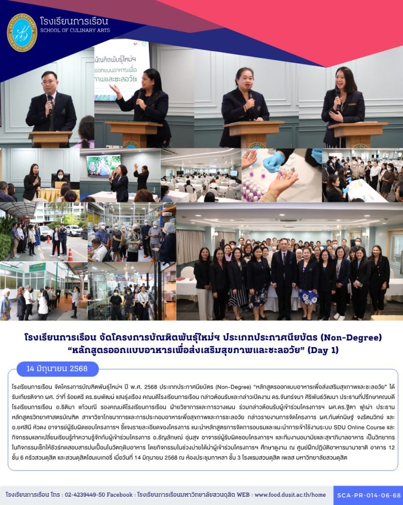 โรงเรียนการเรือน จัดโครงการบัณฑิตพันธุ์ใหม่ฯ ปี พ.ศ. 2568 ประเภทประกาศนียบัตร (Non-Degree) “หลักสูตรออกแบบอาหารเพื่อส่งเสริมสุขภาพและชะลอวัย” ได้รับเกียรติจาก ผศ. ว่าที่ ร้อยตรี ดร.ธนพัฒน์ แสงรุ่งเรือง คณบดีโรงเรียนการเรือน กล่าวต้อนรับและกล่าวเปิดงาน ดร.จันทร์จนา ศิริพันธ์วัฒนา ประธานที่ปรึกษาคณบดีโรงเรียนการเรือน อ.ธิติมา แก้วมณี รองคณบดีโรงเรียนการเรือน ฝ่ายวิชาการและการวางแผน ร่วมกล่าวต้อนรับผู้เข้าร่วมโครงการฯ ผศ.ดร.ฐิตา ฟูเผ่า ประธานหลักสูตรวิทยาศาสตรบัณฑิต สาขาวิชาโภชนาการและการประกอบอาหารเพื่อสุขภาพและการชะลอวัย กล่าวรายงานการจัดโครงการ ผศ.กันต์กนิษฐ์ จงรัตนวิทย์ และ อ.ยศสินี หัวดง อาจารย์ผู้รับผิดชอบโครงการฯ ชี้แจงรายละเอียดของโครงการ แนะนำหลักสูตรการจัดการอบรมและแนะนำการเข้าใช้งานระบบ SDU Online Course และกิจกรรมแลกเปลี่ยนเรียนรู้ทำความรู้จักกับผู้เข้าร่วมโครงการ อ.ธัญลักษณ์ อุ่นสุข อาจารย์ผู้รับผิดชอบโครงการฯ และทีมงานอนามัยและสุขาภิบาลอาหาร เป็นวิทยากรในกิจกรรมเช็กให้ชัวร์ทดสอบสารปนเปื้อนในวัตถุดิบอาหาร โดยกิจกรรมในช่วงบ่ายได้นำผู้เข้าร่วมโครงการฯ ศึกษาดูงาน ณ ศูนย์ฝึกปฏิบัติอาหารนานาชาติ อาคาร 12 ชั้น 6 ครัวสวนดุสิต และสวนดุสิตโฮมเบเกอรี่ เมื่อวันที่ 14 มิถุนายน 2568 ณ ห้องประชุมกาหลา ชั้น 3 โรงแรมสวนดุสิต เพลส มหาวิทยาลัยสวนดุสิต