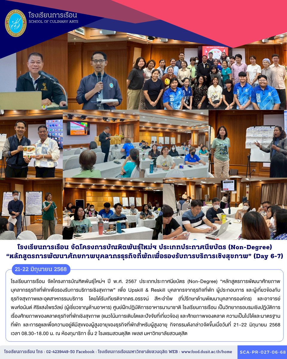 โรงเรียนการเรือน จัดโครงการบัณฑิตพันธุ์ใหม่ฯ ปี พ.ศ. 2567 ประเภทประกาศนียบัตร (Non-Degree) “หลักสูตรการพัฒนาศักยภาพบุคลากรธุรกิจที่พักเพื่อรองรับการบริการเชิงสุขภาพ” เพื่อ Upskill & Reskill บุคลากรจากธุรกิจที่พัก ผู้ประกอบการ และผู้เกี่ยวข้องกับธุรกิจสุขภาพและอุตสาหกรรมบริการ โดยได้รับเกียรติจากดร.อรรจน์ สีหะอำไพ (ที่ปรึกษาด้านพัฒนาบุคลากรองค์กร) และอาจารย์ พงศ์อนันต์ ศิริแสงไพรวัลย์ (ผู้เชี่ยวชาญด้านอาหาร) ศูนย์ฝึกปฏิบัติการอาหารนานาชาติ โรงเรียนการเรือน เป็นวิทยากรอบรมเชิงปฏิบัติการเรื่องศักยภาพของตลาดธุรกิจที่พักเชิงสุขภาพ (แนวโน้มการเติบโตและปัจจัยที่เกี่ยวข้อง) และศักยภาพของตลาด ความเป็นไปได้และมาตรฐาน ที่พัก และการดูแลเพื่อความอยู่ดีมีสุขของผู้สูงอายุของธุรกิจที่พักสำหรับผู้สูงอายุ กิจกรรมดังกล่าวจัดขึ้นเมื่อวันที่ 21-22 มิถุนายน 2568 เวลา 08.30-18.00 น. ณ ห้องกุมาริกา ชั้น 2 โรงแรมสวนดุสิต เพลส มหาวิทยาลัยสวนดุสิต