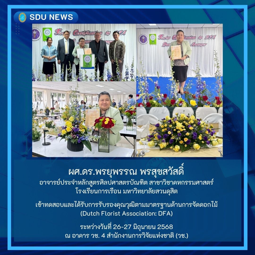 ผศ.ดร.พรยุพรรณ พรสุขสวัสดิ์ เข้าทดสอบและได้รับการรับรองคุณวุฒิตามมาตรฐานด้านการจัดดอกไม้ (Dutch Florist Association: DFA)