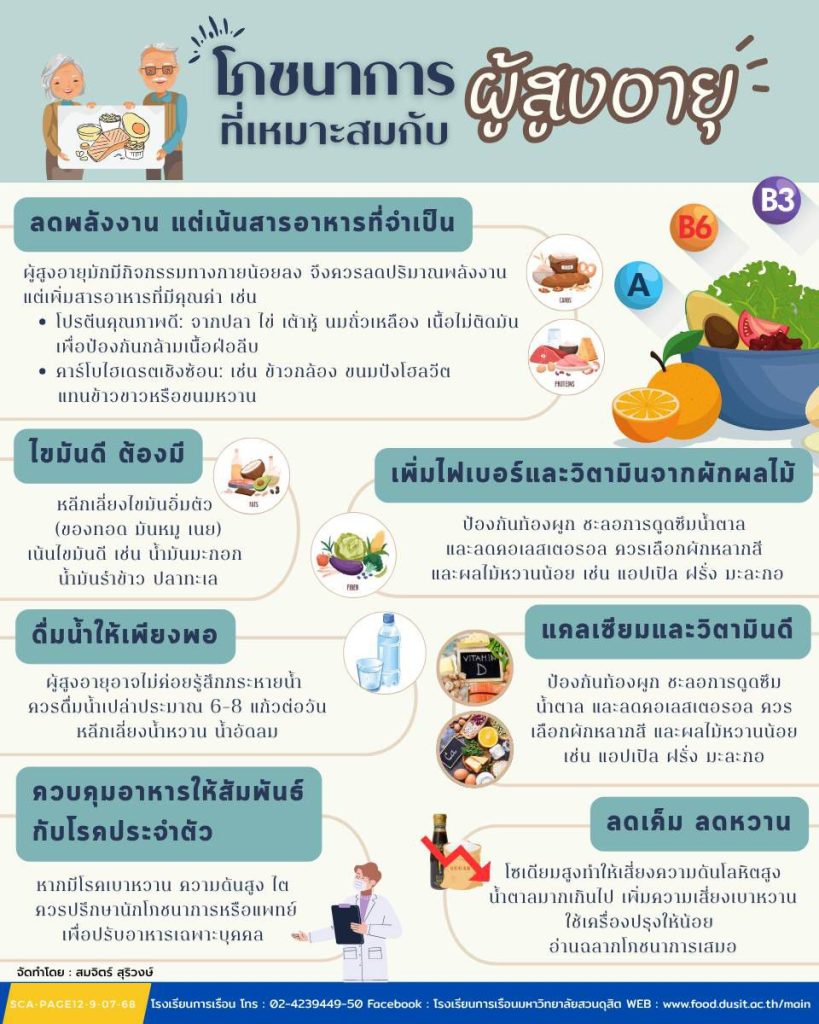 ผู้สูงอายุ มีความเสื่อมของร่างกายที่เพิ่มขึ้นตามวัย อาหารและโภชนาการสำหรับผู้สูงอายุมีความสำคัญต่อสุขภาพ และความเป็นอยู่ที่ดี ผู้สูงอายุควรได้รับสารอาหารที่เพียงพอ สัดส่วนที่เหมาะสม ครบ 5 หมู่ ลด อาหารลดจัด หวาน มัน เค็ม หมั่นดูแลน้ำหนักตัว เพื่อป้องกันโรคที่อาจจะเกิดจากโภชนาการที่ไม่เหมาะสม