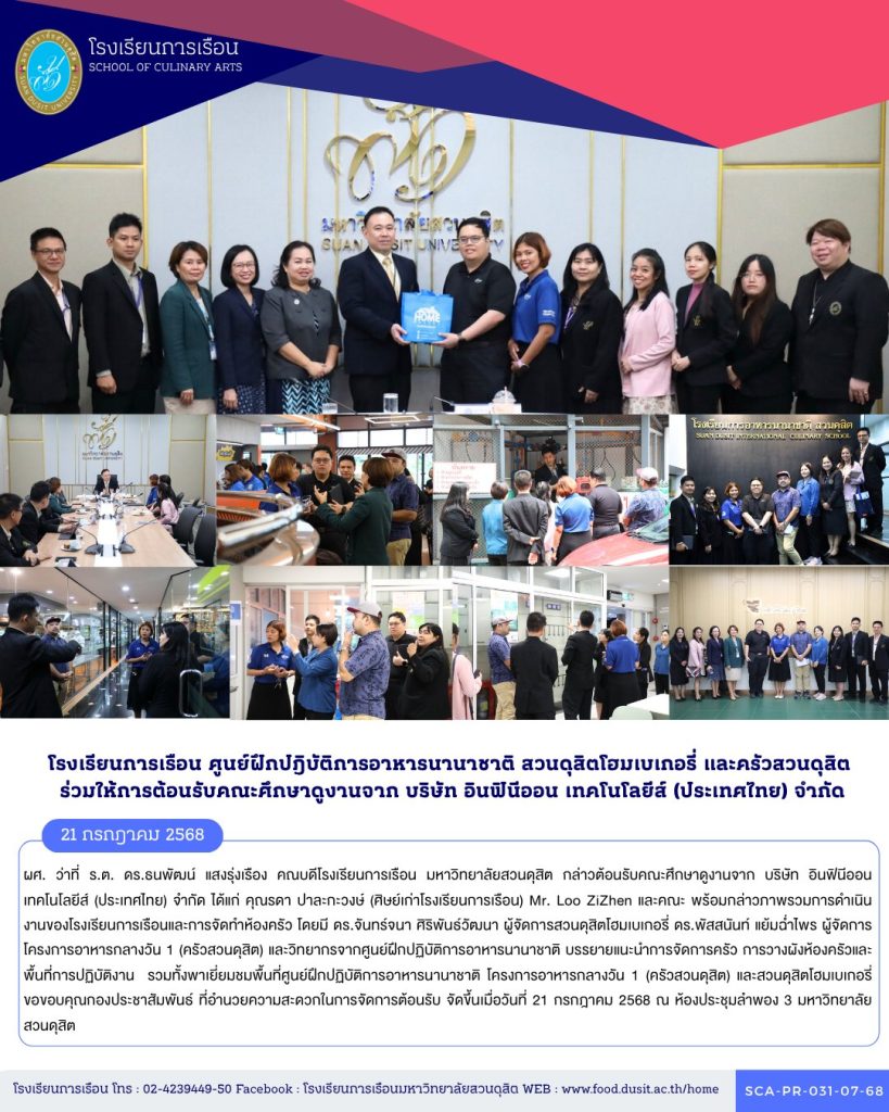 ผศ. ว่าที่ ร.ต. ดร.ธนพัฒน์ แสงรุ่งเรือง คณบดีโรงเรียนการเรือน มหาวิทยาลัยสวนดุสิต กล่าวต้อนรับคณะศึกษาดูงานจาก บริษัท อินฟินีออน เทคโนโลยีส์ (ประเทศไทย) จำกัด ได้แก่ คุณรดา ปาละกะวงษ์ (ศิษย์เก่าโรงเรียนการเรือน) Mr. Loo ZiZhen และคณะ พร้อมกล่าวภาพรวมการดำเนินงานของโรงเรียนการเรือนและการจัดทำห้องครัว โดยมี ดร.จันทร์จนา ศิริพันธ์วัฒนา ผู้จัดการสวนดุสิตโฮมเบเกอรี่ ดร.พัสสนันท์ แย้มฉ่ำไพร ผู้จัดการโครงการอาหารกลางวัน 1 (ครัวสวนดุสิต) และวิทยากรจากศูนย์ฝึกปฏิบัติการอาหารนานาชาติ บรรยายแนะนำการจัดการครัว การวางผังห้องครัวและพื้นที่การปฏิบัติงาน รวมทั้งพาเยี่ยมชมพื้นที่ศูนย์ฝึกปฏิบัติการอาหารนานาชาติ โครงการอาหารกลางวัน 1 (ครัวสวนดุสิต) และสวนดุสิตโฮมเบเกอรี่ ขอขอบคุณกองประชาสัมพันธ์ ที่อำนวยความสะดวกในการจัดการต้อนรับ จัดขึ้นเมื่อวันที่ 21 กรกฎาคม 2568 ณ ห้องประชุมลำพอง 3 มหาวิทยาลัยสวนดุสิต