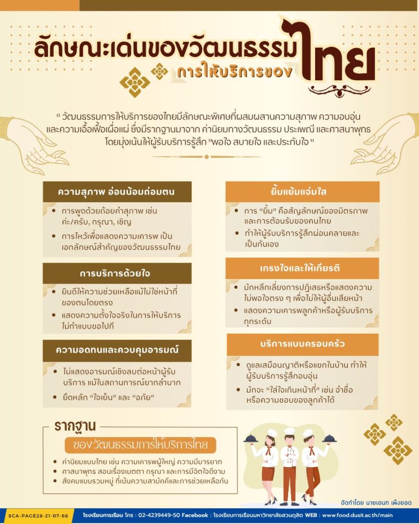 วัฒนธรรมการให้บริการของไทยมีลักษณะพิเศษที่ผสมผสานความสุภาพ ความอบอุ่น และความเอื้อเฟื้อเผื่อแผ่ ซึ่งมีรากฐานมาจาก ค่านิยมทางวัฒนธรรม ประเพณี และศาสนาพุทธ โดยมุ่งเน้นให้ผู้รับบริการรู้สึก “พอใจ สบายใจ และประทับใจ”