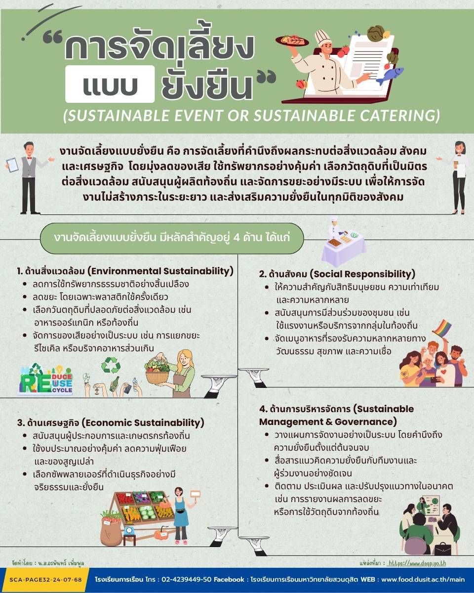 งานจัดเลี้ยงแบบยั่งยืน คือ การจัดเลี้ยงที่คำนึงถึงผลกระทบต่อสิ่งแวดล้อม สังคม และเศรษฐกิจ โดยมุ่งลดของเสีย ใช้ทรัพยากรอย่างคุ้มค่า เลือกวัตถุดิบที่เป็นมิตรต่อสิ่งแวดล้อม สนับสนุนผู้ผลิตท้องถิ่น และจัดการขยะอย่างมีระบบ เพื่อให้การจัดงานไม่สร้างภาระในระยะยาวและส่งเสริมความยั่งยืนในทุกมิติของสังคม มีหลักสำคัญอยู่ 4 ด้าน ได้แก่