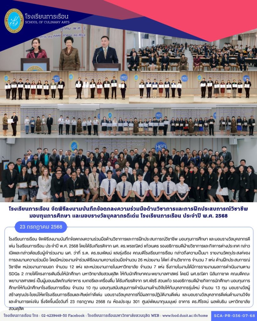 โรงเรียนการเรือน จัดพิธีลงนามบันทึกข้อตกลงความร่วมมือด้านวิชาการและการฝึกประสบการณ์วิชาชีพ มอบทุนการศึกษา และมอบรางวัลบุคลากรดีเด่น โรงเรียนการเรือน ประจำปี พ.ศ. 2568 โดยได้รับเกียรติจาก ผศ. ดร.พรชณิตว์ แก้วเนตร รองอธิการบดีฝ่ายวิชาการและกิจการต่างประเทศ กล่าวเปิดและกล่าวต้อนรับผู้เข้าร่วมงาน ผศ. ว่าที่ ร.ต. ดร.ธนพัฒน์ แสงรุ่งเรือง คณบดีโรงเรียนการเรือน กล่าวถึงความเป็นมา รายงานวัตถุประสงค์ของการลงนามความร่วมมือ โดยมีหน่วยงานเข้าร่วมพิธีลงนามความร่วมมือจำนวน 26 หน่วยงาน ได้แก่ ด้านวิชาการ จำนวน 7 แห่ง ด้านฝึกประสบการณ์วิชาชีพ หน่วยงานภายนอก จำนวน 12 แห่ง และหน่วยงานภายในมหาวิทยาลัย จำนวน 7 แห่ง ซึ่งภายในงานได้มีการรายงานผลการดำเนินงานตาม SDGs 2 ภายใต้โครงการเติมอิ่มให้นักศึกษา มหาวิทยาลัยสวนดุสิต ให้กับนักศึกษาคณะพยาบาลศาสตร์ โดยมี ผศ.ธณิดา นิลัมภาชาด คณบดีคณะพยาบาลศาสตร์ เป็นผู้มอบผลิตภัณฑ์อาหาร เบเกอรีและเครื่องดื่ม ได้รับเกียรติจาก รศ.พัชรี สวนแก้ว รองอธิการบดีฝ่ายกิจการนักศึกษา มอบทุนการศึกษาให้กับนักศึกษาโรงเรียนการเรือน จำนวน 10 ทุน มอบทุนสนับสนุนการดำเนินงานด้านวิจัยให้กับบุคลากรรุ่นใหม่ จำนวน 13 ทุน มอบรางวัลผู้สร้างคุณประโยชน์ให้แก่โรงเรียนการเรือนและศิษย์เก่าดีเด่น มอบรางวัลบุคลากรที่มีผลการปฏิบัติงานดีเด่น และมอบรางวัลบุคลากรดีเด่นด้านงานวิจัยและด้านการแข่งขัน ซึ่งจัดขึ้นเมื่อวันที่ 23 กรกฎาคม 2568 ณ ห้องประชุม 301 ศูนย์พัฒนาทุนมนุษย์ อาคาร ดร.ศิโรจน์ ผลพันธิน มหาวิทยาลัยสวนดุสิต