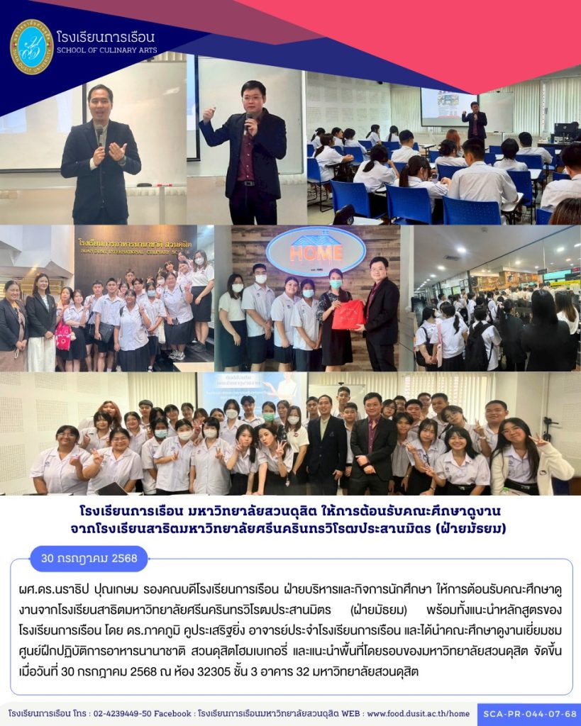 ผศ.ดร.นราธิป ปุณเกษม รองคณบดีโรงเรียนการเรือน ฝ่ายบริหารและกิจการนักศึกษา ให้การต้อนรับคณะศึกษาดูงานจากโรงเรียนสาธิตมหาวิทยาลัยศรีนครินทรวิโรฒประสานมิตร (ฝ่ายมัธยม) พร้อมทั้งแนะนำหลักสูตรของโรงเรียนการเรือน โดย ดร.ภาคภูมิ คูประเสริฐยิ่ง อาจารย์ประจำโรงเรียนการเรือน และได้นำคณะศึกษาดูงานเยี่ยมชมศูนย์ฝึกปฏิบัติการอาหารนานาชาติ สวนดุสิตโฮมเบเกอรี่ และแนะนำพื้นที่โดยรอบของมหาวิทยาลัยสวนดุสิต จัดขึ้นเมื่อวันที่ 30 กรกฎาคม 2568 ณ ห้อง 32305 ชั้น 3 อาคาร 32 มหาวิทยาลัยสวนดุสิต