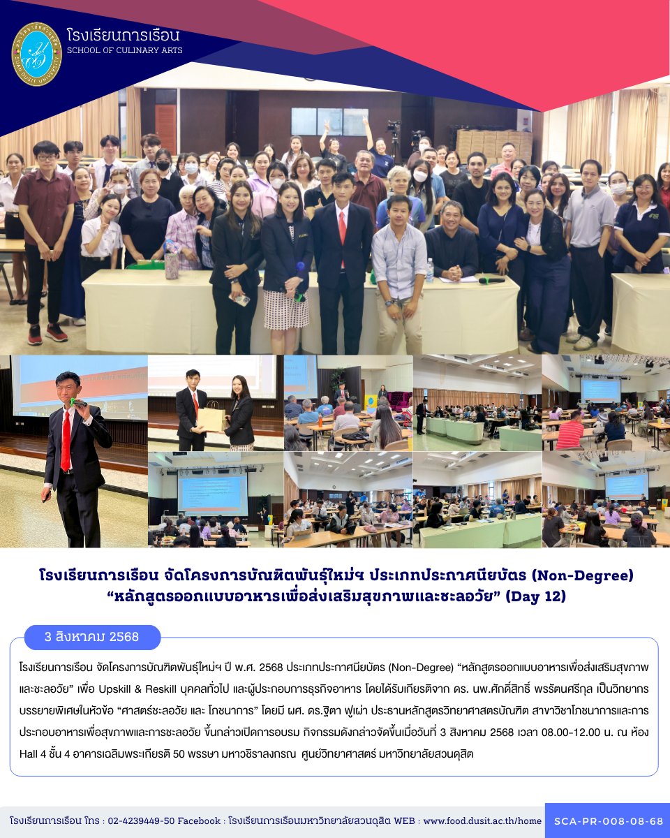 โรงเรียนการเรือน จัดโครงการบัณฑิตพันธุ์ใหม่ฯ ปี พ.ศ. 2568 ประเภทประกาศนียบัตร (Non-Degree) “หลักสูตรออกแบบอาหารเพื่อส่งเสริมสุขภาพและชะลอวัย” เพื่อ Upskill & Reskill บุคคลทั่วไป และผู้ประกอบการธุรกิจอาหาร (Day 12)
